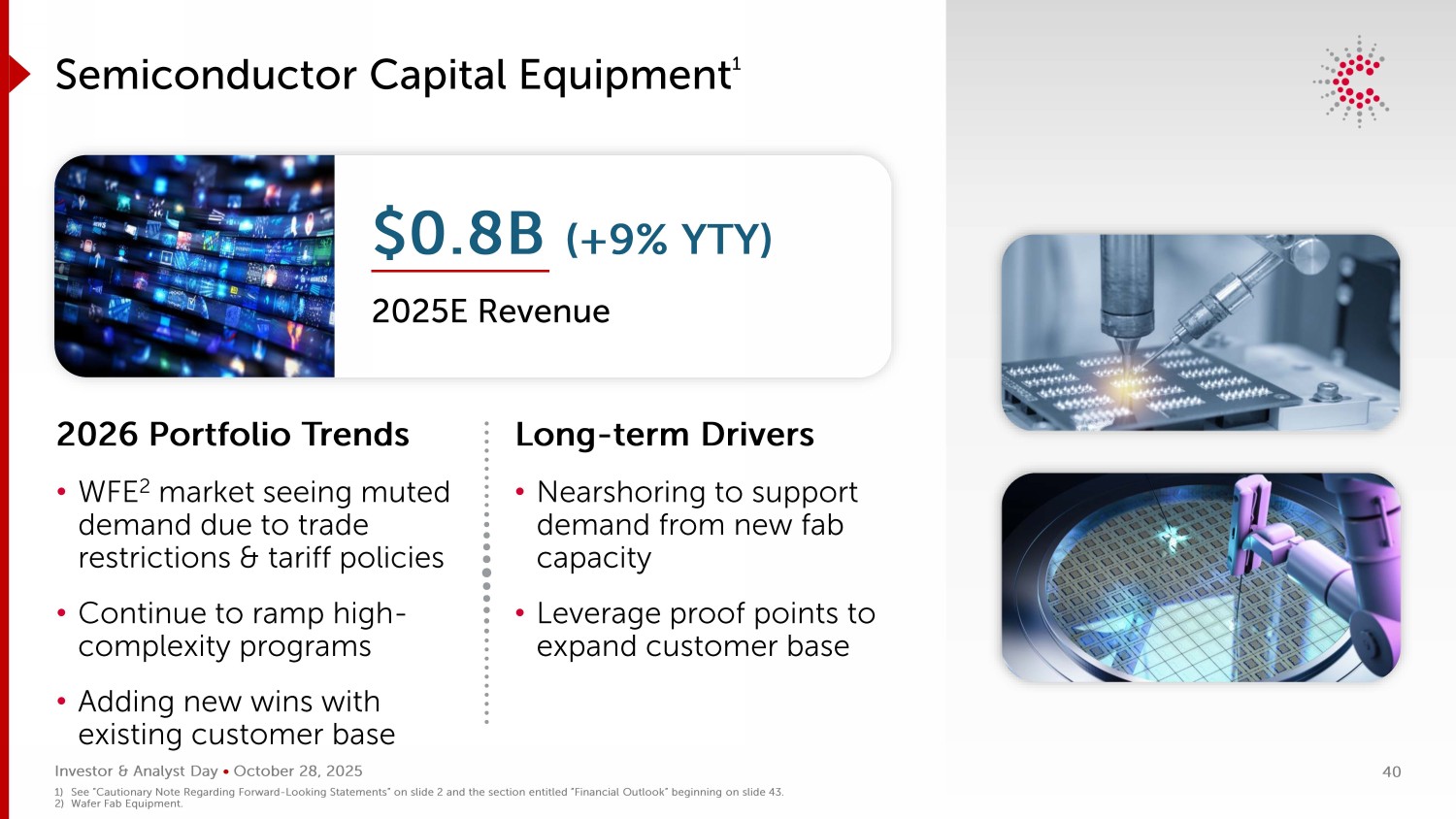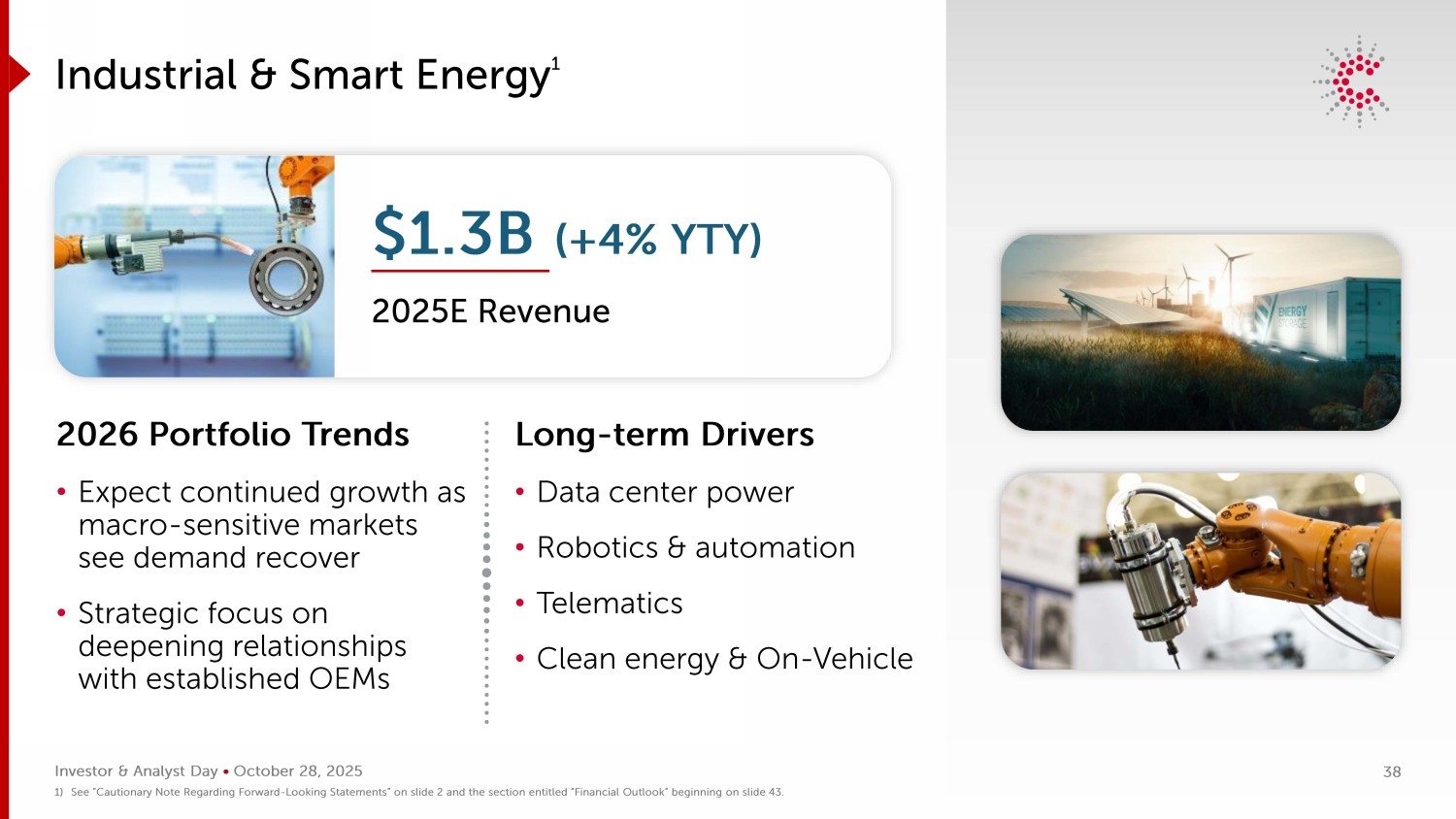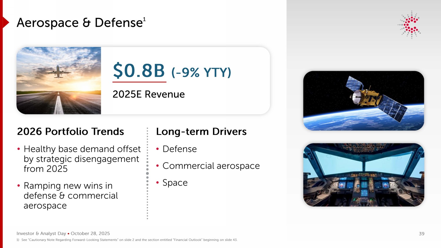 Investor & Analyst Day • October 28, 2025 Industrial & Smart Energy 1 2026 Portfolio Trends • Expect continued growth as macro - sensitive markets see demand recover • Strategic focus on deepening relationships with established OEMs Long - term Drivers • Data center power • Robotics & automation • Telematics • Clean energy & On - Vehicle $1.3B (+ 4 % YTY) 2025E Revenue 1) See “Cautionary Note Regarding Forward - Looking Statements” on slide 2 and the section entitled “Financial Outlook” beginning on slide 43. 38 Investor & Analyst Day • October 28, 2025 Aerospace & Defense 1 2026 Portfolio Trends • Healthy base demand offset by strategic disengagement from 2025 • Ramping new wins in defense & commercial aerospace Long - term Drivers • Defense • Commercial aerospace • Space $0.8B ( - 9% YTY) 2025E Revenue 1) See “Cautionary Note Regarding Forward - Looking Statements” on slide 2 and the section entitled “Financial Outlook” beginning on slide 43.