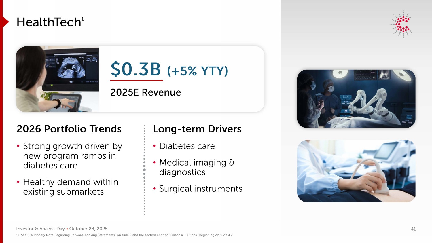 Investor & Analyst Day • October 28, 2025 Semiconductor Capital Equipment 1 2026 Portfolio Trends • WFE 2 market seeing muted demand due to trade restrictions & tariff policies • Continue to ramp high - complexity programs • Adding new wins with existing customer base Long - term Drivers • Nearshoring to support demand from new fab capacity • Leverage proof points to expand customer base $0.8B (+9% YTY) 2025E Revenue 1) See “Cautionary Note Regarding Forward - Looking Statements” on slide 2 and the section entitled “Financial Outlook” beginning on slide 43. 2) Wafer Fab Equipment. 40 Investor & Analyst Day • October 28, 2025 HealthTech 1 2026 Portfolio Trends • Strong growth driven by new program ramps in diabetes care • Healthy demand within existing submarkets Long - term Drivers • Diabetes care • Medical imaging & diagnostics • Surgical instruments $0.3B (+5% YTY) 2025E Revenue 1) See “Cautionary Note Regarding Forward - Looking Statements” on slide 2 and the section entitled “Financial Outlook” beginning on slide 43.