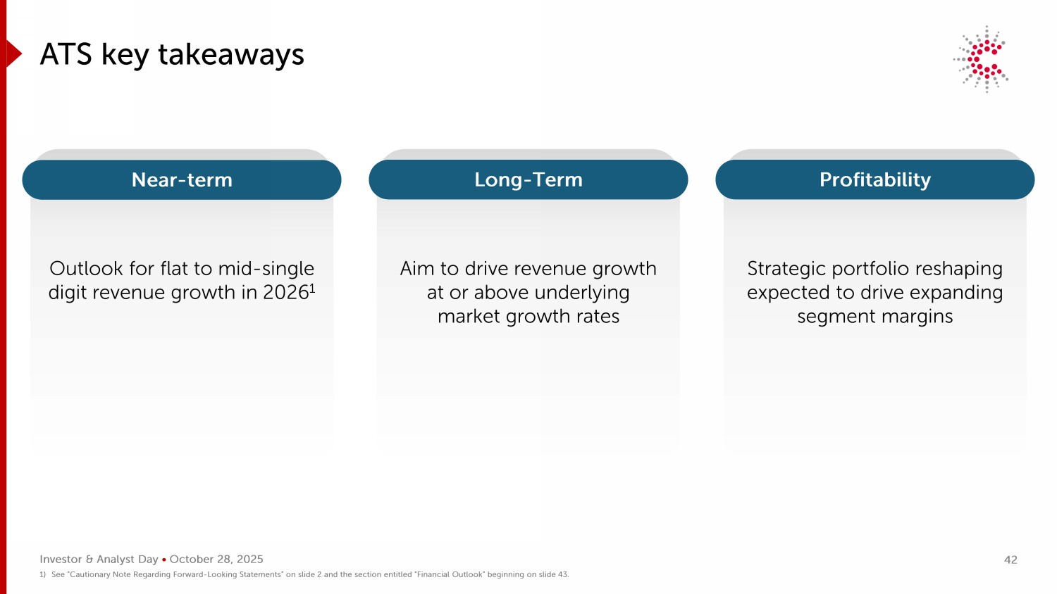 Investor & Analyst Day • October 28, 2025 Strategic portfolio reshaping expected to drive expanding segment margins Aim to drive revenue growth at or above underlying market growth rates Outlook for flat to mid - single digit revenue growth in 2026 1 ATS key takeaways Near - term Long - Term Profitability 1) See “Cautionary Note Regarding Forward - Looking Statements” on slide 2 and the section entitled “Financial Outlook” beginning on slide 43. 42 2025 INVESTOR & ANALYST DAY Financial Outlook Mandeep Chawla Chief Financial Officer