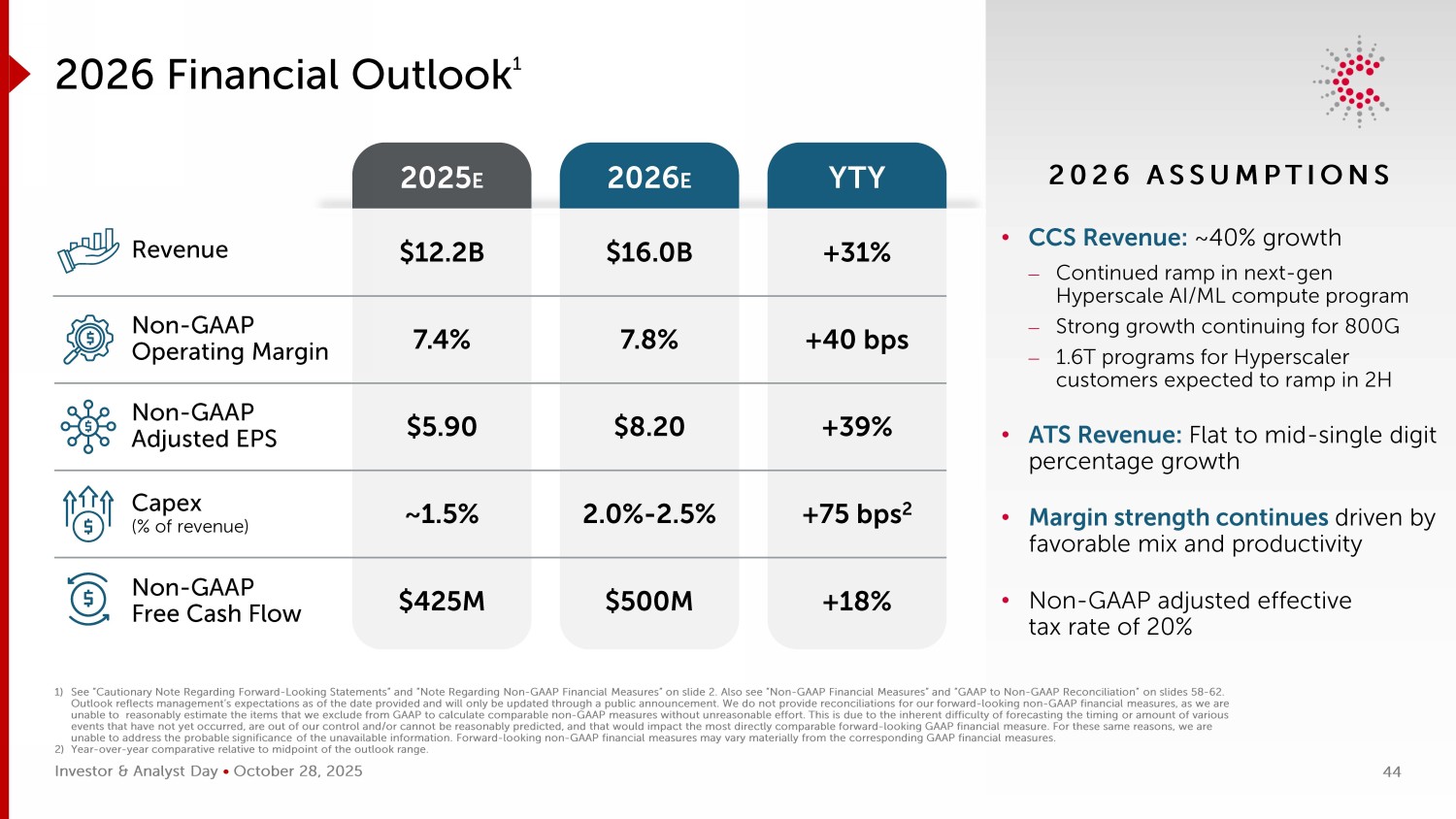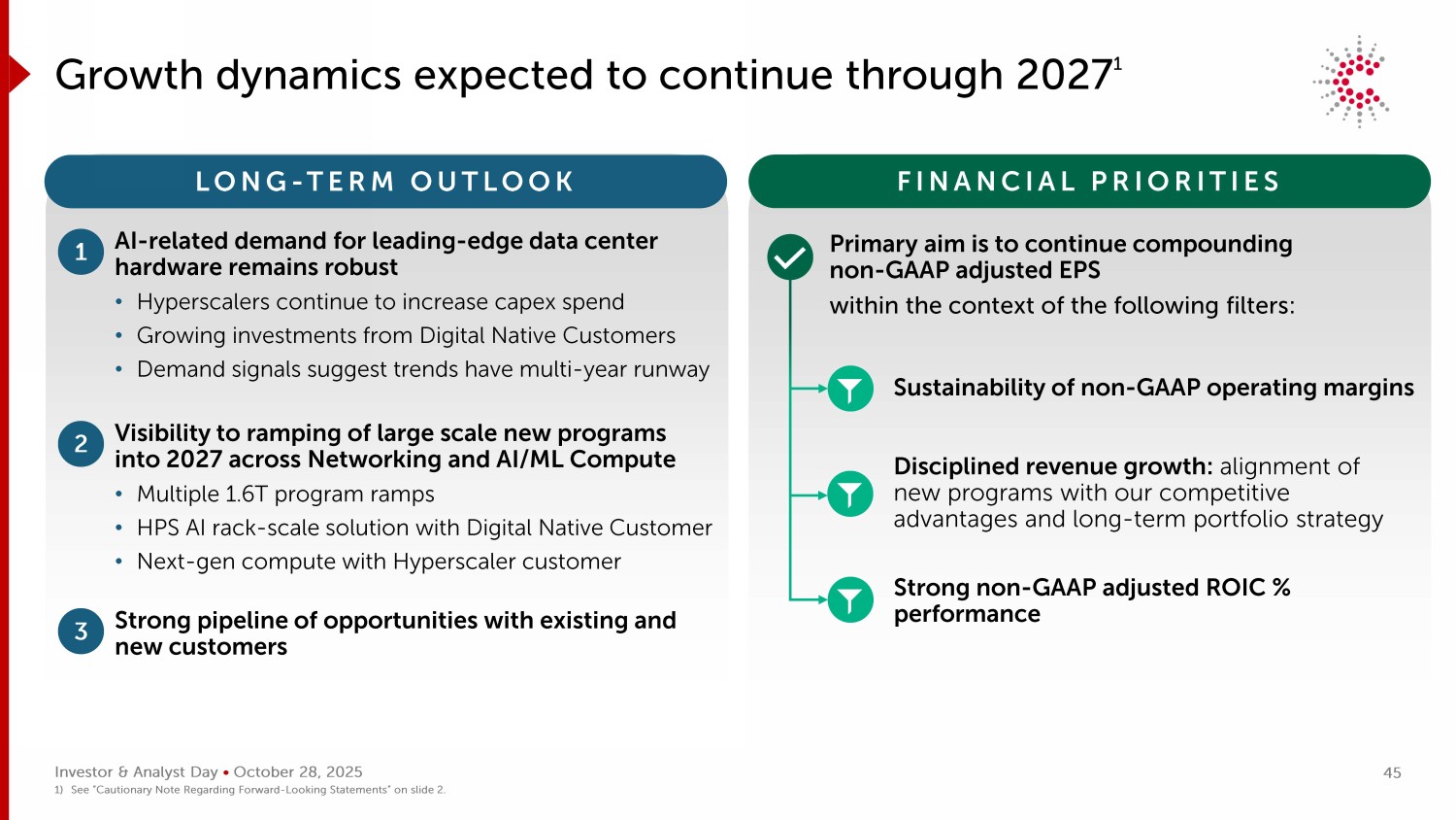 Investor & Analyst Day • October 28, 2025 2026 ASSUMPTIONS • CCS Revenue: ~40% growth ⎼ Continued ramp in next - gen Hyperscale AI/ML compute program ⎼ Strong growth continuing for 800G ⎼ 1.6T programs for Hyperscaler customers expected to ramp in 2H • ATS Revenue: Flat to mid - single digit percentage growth • Margin strength continues driven by favorable mix and productivity • Non - GAAP adjusted effective tax rate of 20% 2026 Financial Outlook 1 2025 E 2026 E YTY $12.2B 7.4% $5.90 ~1.5% $425M $16.0B 7.8% $8.20 2.0% - 2.5% $500M +31% +40 bps +39% +75 bps 2 +18% Revenue Non - GAAP Operating Margin Non - GAAP Adjusted EPS Capex (% of revenue) Non - GAAP Free Cash Flow 1) See “Cautionary Note Regarding Forward - Looking Statements” and “Note Regarding Non - GAAP Financial Measures” on slide 2. Also see “Non - GAAP Financial Measures” and “GAAP to Non - GAAP Reconciliation” on slides 58 - 62. Outlook reflects management’s expectations as of the date provided and will only be updated through a public announcement. We do not provide reconciliations for our forward - looking non - GAAP financial measures, as we are unable to reasonably estimate the items that we exclude from GAAP to calculate comparable non - GAAP measures without unreasonabl e effort. This is due to the inherent difficulty of forecasting the timing or amount of various events that have not yet occurred, are out of our control and/or cannot be reasonably predicted, and that would impact the mo st directly comparable forward - looking GAAP financial measure. For these same reasons, we are unable to address the probable significance of the unavailable information. Forward - looking non - GAAP financial measures may vary materially from the corresponding GAAP financial measures. 2) Year - over - year comparative relative to midpoint of the outlook range. 44 Investor & Analyst Day • October 28, 2025 Growth dynamics expected to continue through 2027 1 LONG - TERM OUTLOOK FINANCIAL PRIORITIES 1 AI - related demand for leading - edge data center hardware remains robust • Hyperscalers continue to increase capex spend • Growing investments from Digital Native Customers • Demand signals suggest trends have multi - year runway 2 Visibility to ramping of large scale new programs into 2027 across Networking and AI/ML Compute • Multiple 1.6T program ramps • HPS AI rack - scale solution with Digital Native Customer • Next - gen compute with Hyperscaler customer 3 Strong pipeline of opportunities with existing and new customers Primary aim is to continue compounding non - GAAP adjusted EPS within the context of the following filters: Sustainability of non - GAAP operating margins Disciplined revenue growth: alignment of new programs with our competitive advantages and long - term portfolio strategy Strong non - GAAP adjusted ROIC % performance 1) See “Cautionary Note Regarding Forward - Looking Statements” on slide 2.