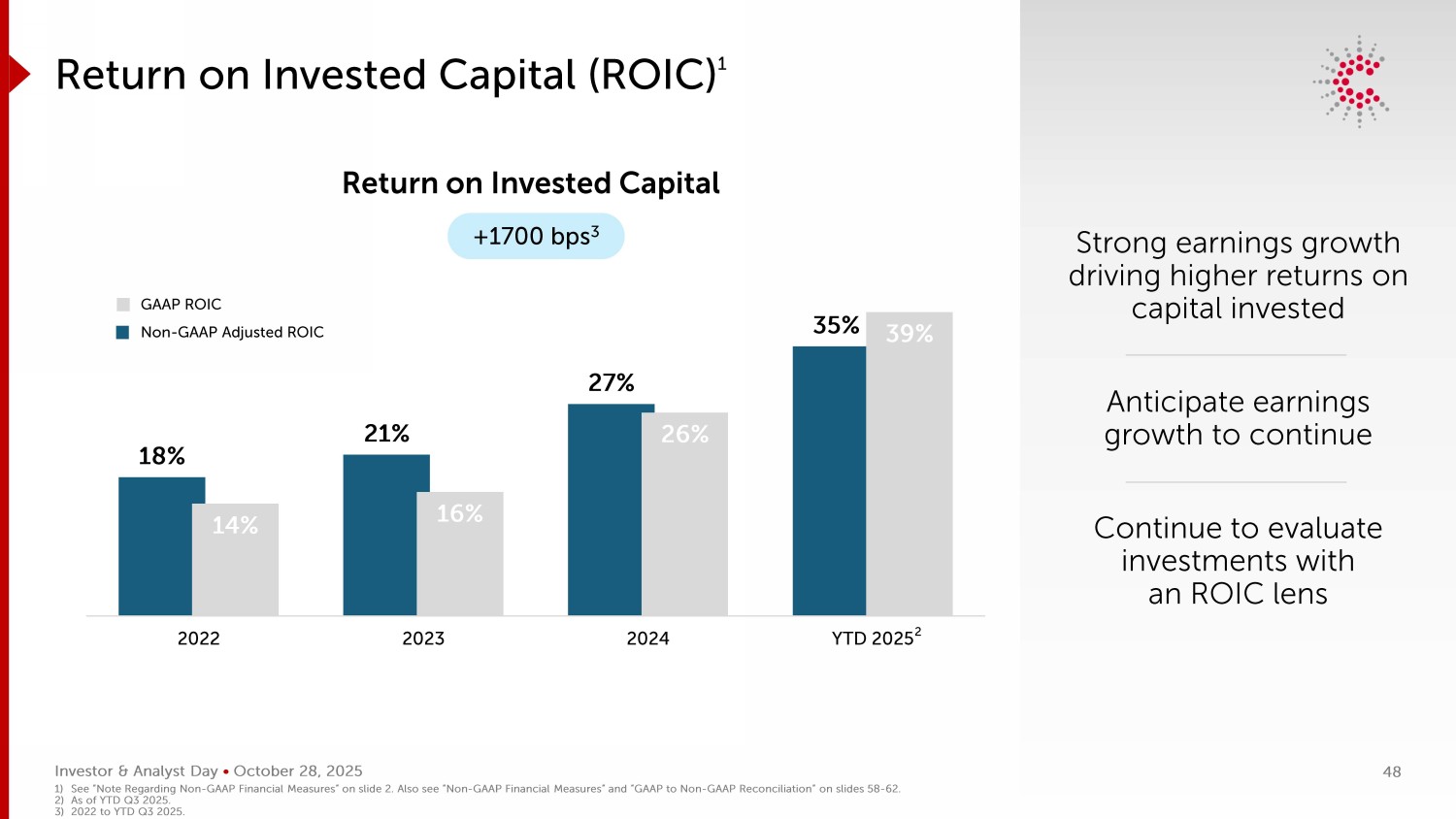 Also see “Non - GAAP Financial Measures” and “GAAP to Non - GAAP Reconciliation” on slides 58 - 62. 2) 2022 to 2026E. 47 Investor & Analyst Day • October 28, 2025 18% 21% 27% 35% 14% 16% 26% 39% 2022 2023 2024 YTD 2025 Return on Invested Capital (ROIC) 1 Return on Invested Capital +1700 bps 3 GAAP ROIC Non - GAAP Adjusted ROIC 1) See “Note Regarding Non - GAAP Financial Measures” on slide 2.