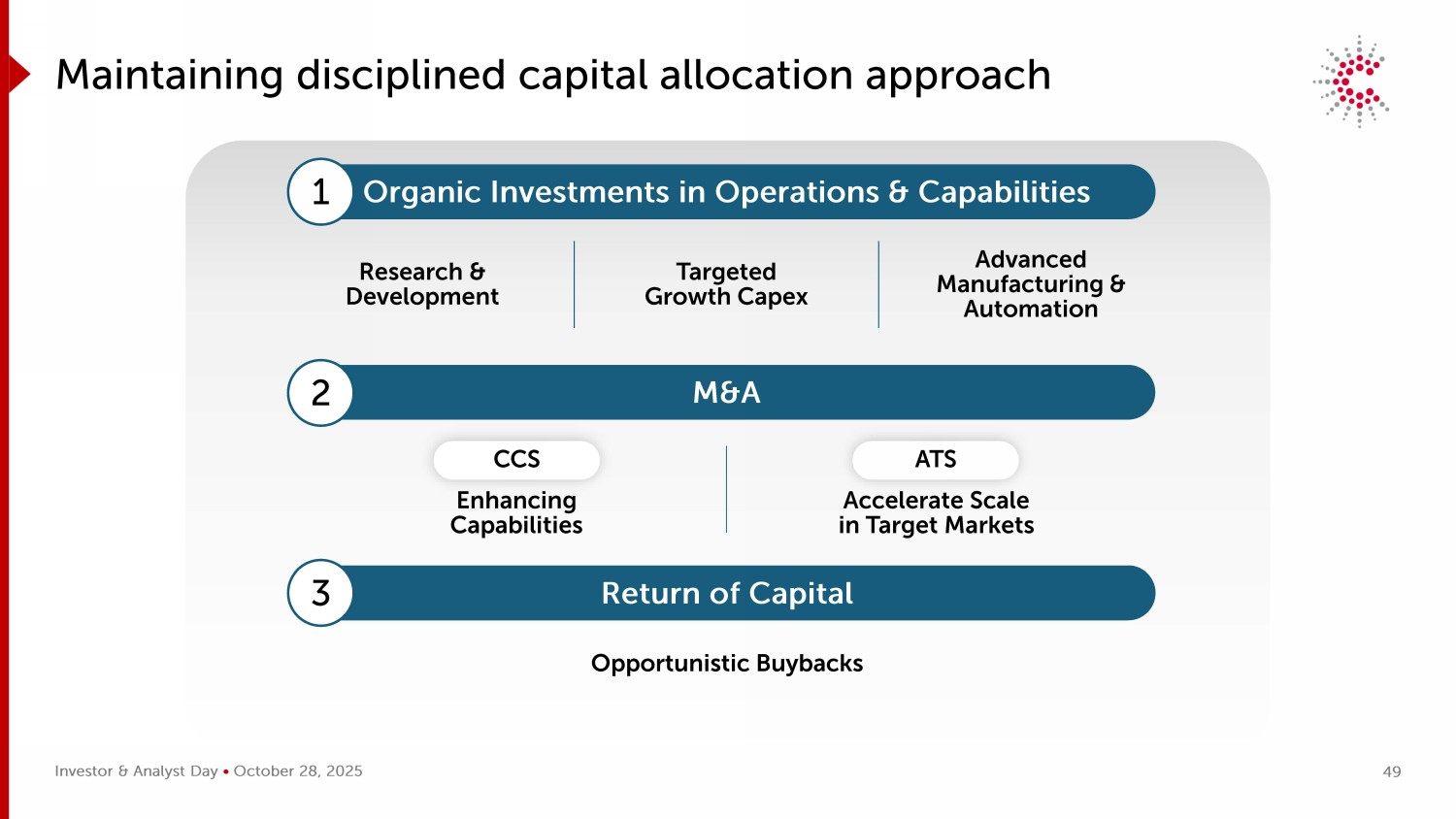 Also see “Non - GAAP Financial Measures” and “GAAP to Non - GAAP Reconc iliation” on slides 58 - 62. 2) As of YTD Q3 2025. 3) 2022 to YTD Q3 2025. 48 Strong earnings growth driving higher returns on capital invested Anticipate earnings growth to continue Continue to evaluate investments with an ROIC lens 2 Investor & Analyst Day • October 28, 2025 Maintaining disciplined capital allocation approach Organic Investments in Operations & Capabilities Research & Development Targeted Growth Capex Advanced Manufacturing & Automation M&A Enhancing Capabilities Accelerate Scale in Target Markets Return of Capital Opportunistic Buybacks CCS ATS 1 2 3 49