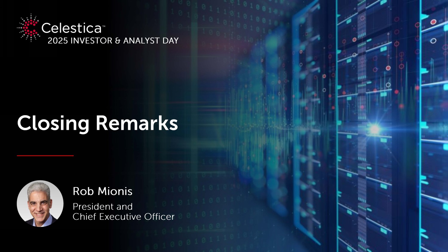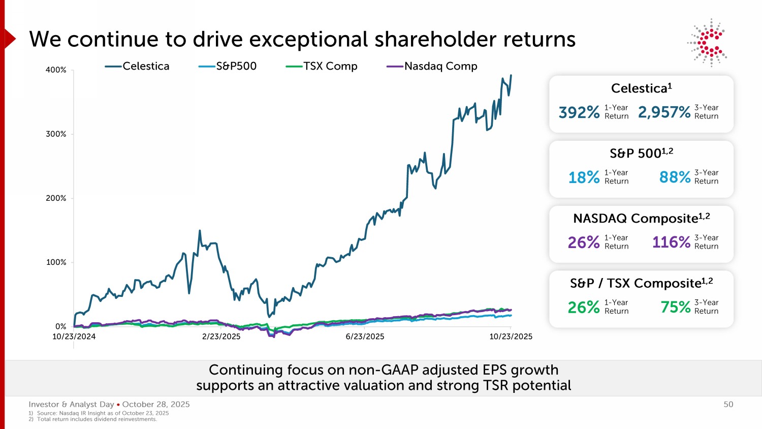 Investor & Analyst Day • October 28, 2025 -100% 0% 100% 200% 300% 400% 10/23/2024 2/23/2025 6/23/2025 10/23/2025 Celestica S&P500 TSX Comp Nasdaq Comp We continue to drive exceptional shareholder returns Celestica 1 392 % 1 - Year Return 2,957% 3 - Year Return S&P 500 1,2 18 % 1 - Year Return 88% 3 - Year Return S&P / TSX Composite 1,2 26 % 1 - Year Return 75% 3 - Year Return NASDAQ Composite 1,2 26 % 1 - Year Return 116% 3 - Year Return Investor & Analyst Day • October 28, 2025 Continuing focus on non - GAAP adjusted EPS growth supports an attractive valuation and strong TSR potential 1) Source: Nasdaq IR Insight as of October 23, 2025 2) Total return includes dividend reinvestments. 50 2025 INVESTOR & ANALYST DAY Closing Remarks Rob Mionis President and Chief Executive Officer