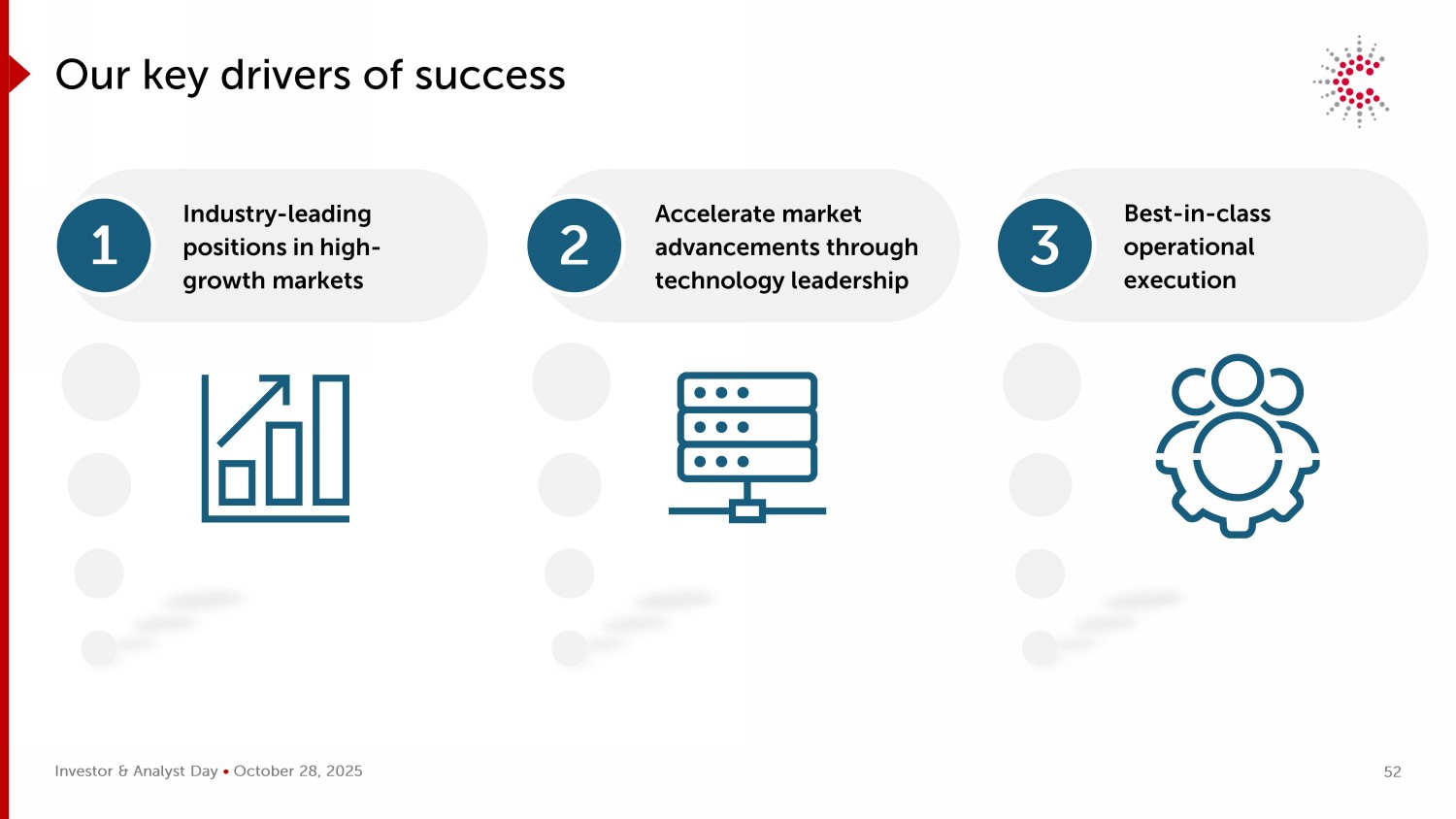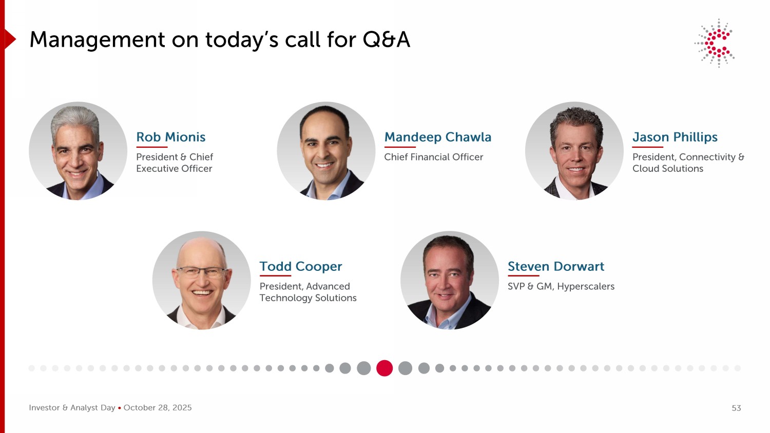 Investor & Analyst Day • October 28, 2025 Our key drivers of success Industry - leading positions in high - growth markets Accelerate market advancements through technology leadership Best - in - class operational execution 1 2 3 52 Investor & Analyst Day • October 28, 2025 Management on today’s call for Q&A Rob Mionis President & Chief Executive Officer Mandeep Chawla Chief Financial Officer Jason Phillips President, Connectivity & Cloud Solutions Steven Dorwart SVP & GM, Hyperscalers Todd Cooper President, Advanced Technology Solutions 53