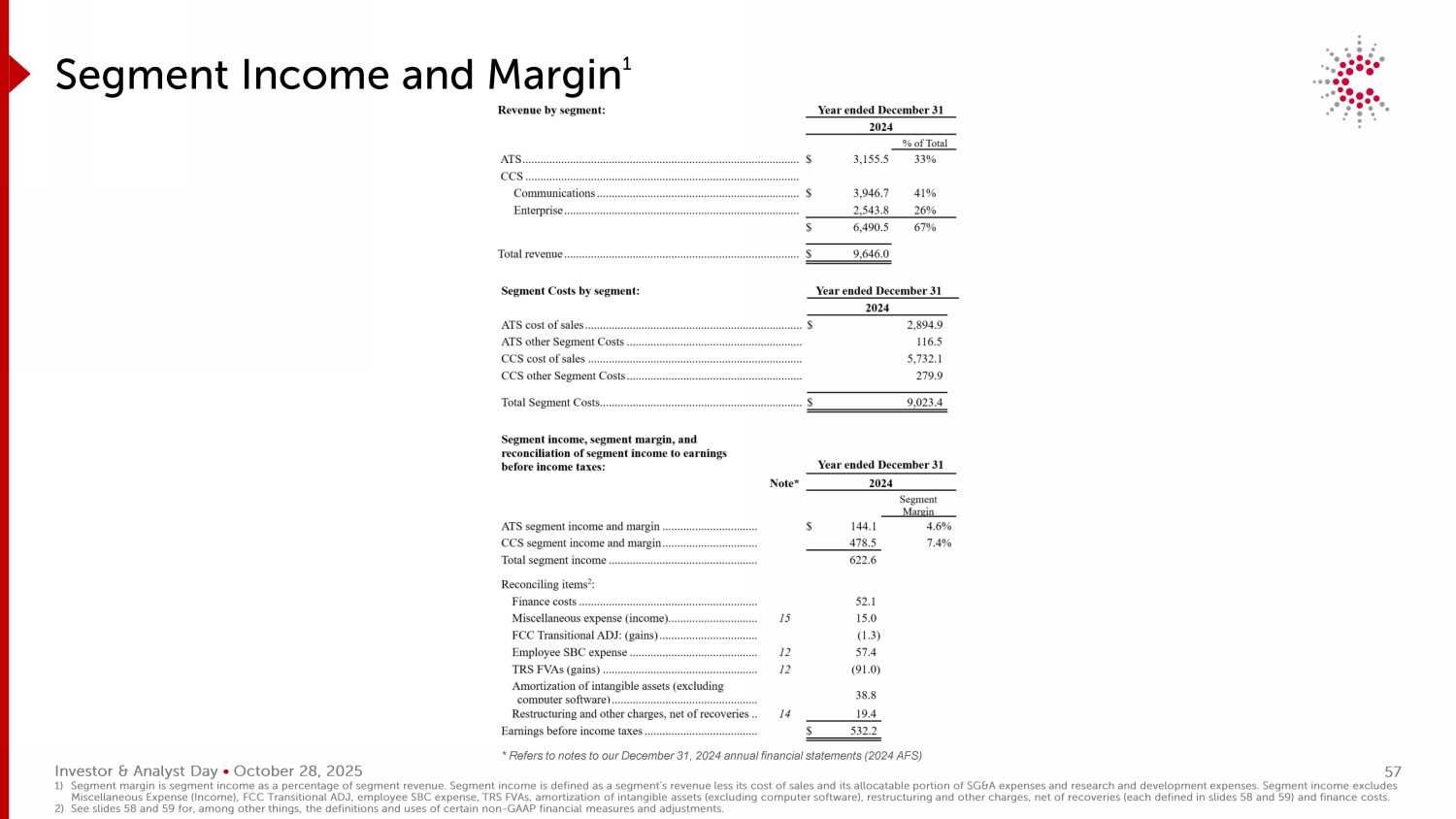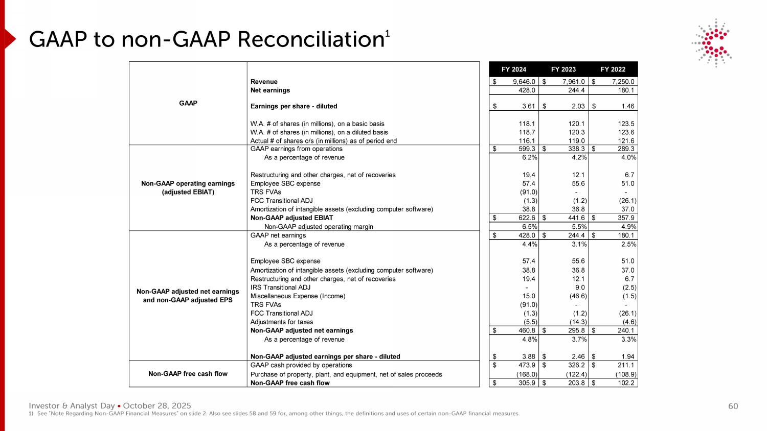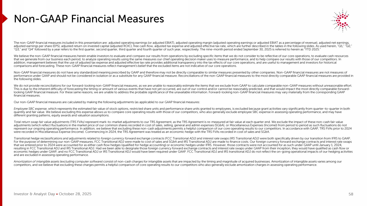 Investor & Analyst Day • October 28, 2025 Segment Income and Margin 1 * Refers to notes to our December 31, 2024 annual financial statements (2024 AFS) 1) Segment margin is segment income as a percentage of segment revenue. Segment income is defined as a segment’s revenue less it s c ost of sales and its allocatable portion of SG&A expenses and research and development expenses. Segment income excludes Miscellaneous Expense (Income), FCC Transitional ADJ, employee SBC expense, TRS FVAs, amortization of intangible assets (excl udi ng computer software), restructuring and other charges, net of recoveries (each defined in slides 58 and 59) and finance cost s. 2) See slides 58 and 59 for, among other things, the definitions and uses of certain non - GAAP financial measures and adjustments. 57 Investor & Analyst Day • October 28, 2025 Non - GAAP Financial Measures The non - GAAP financial measures included in this presentation are: adjusted operating earnings (or adjusted EBIAT), adjusted ope rating margin (adjusted operating earnings or adjusted EBIAT as a percentage of revenue), adjusted net earnings, adjusted earnings per share (EPS), adjusted return on invested capital (adjusted ROIC), free cash flow, adjusted tax expense and adjusted effective tax rate, which are further described in the tables in the following slides.