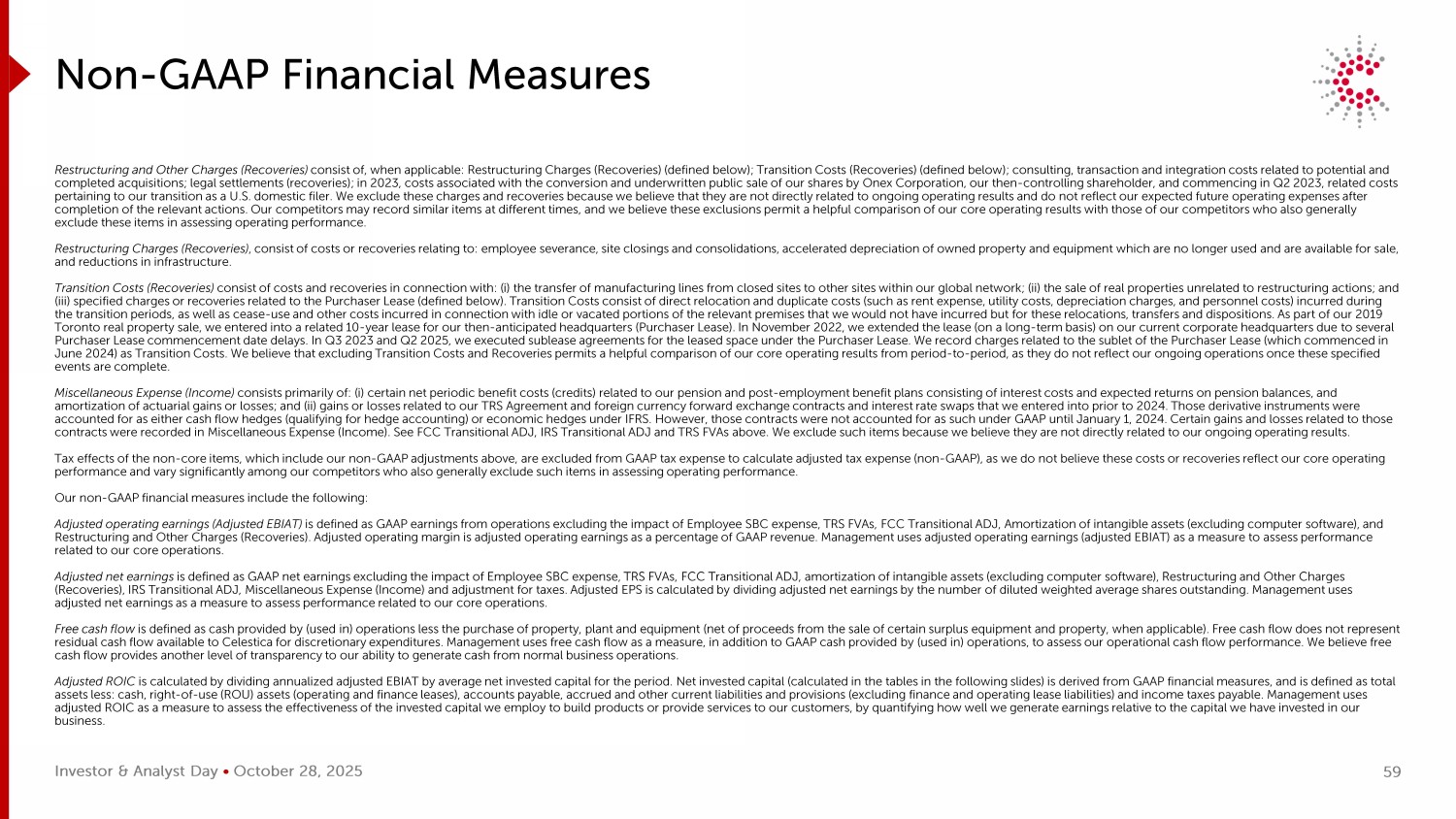 As used herein, "Q1," "Q2," "Q3," and "Q4" followed by a year refers to the first quarter, second quarter, third quarter and fourth quarter of such year, re spectively. The nine - month period ended September 30, 2025 is referred to herein as “YTD 2025.” We believe the non - GAAP financial measures herein enable investors to evaluate and compare our results from operations by exclud ing specific items that we do not consider to be reflective of our core operations, to evaluate cash resources that we generate from our business each period, to analyze operating results using the same measures our chief operating deci sio n maker uses to measure performance, and to help compare our results with those of our competitors. In addition, management believes that the use of adjusted tax expense and adjusted effective tax rate provides additional transp are ncy into the tax effects of our core operations, and are useful to management and investors for historical comparisons and forecasting. These non - GAAP financial measures reflect management’s belief that the excluded items are not indic ative of our core operations. Non - GAAP financial measures do not have any standardized meaning prescribed by GAAP and therefore may not be directly comparable to similar measures presented by other companies. Non - GAAP financial measures are not measures of performance under GAAP and should not be considered in isolation or as a substitute for any GAAP financial measure. Reconcili ati ons of the non - GAAP financial measures to the most directly comparable GAAP financial measures are provided in the following slides. We do not provide reconciliations for our forward - looking non - GAAP financial measures, as we are unable to reasonably estimate t he items that we exclude from GAAP to calculate comparable non - GAAP measures without unreasonable effort. This is due to the inherent difficulty of forecasting the timing or amount of various events that have not yet occurred, are out of our control and/or cannot be reasonably predicted, and that would impact the most directly comparable forward - looking GAAP financial measure. For these same reasons, we are unable to address the probable significance of the unavailable in formation. Forward - looking non - GAAP financial measures may vary materially from the corresponding GAAP financial measures. Our non - GAAP financial measures are calculated by making the following adjustments (as applicable) to our GAAP financial measure s: Employee SBC expense , which represents the estimated fair value of stock options, restricted share units and performance share units granted to e mpl oyees, is excluded because grant activities vary significantly from quarter - to - quarter in both quantity and fair value. We believe excluding this expense allows us to compare core operating results with those of our comp eti tors, who also generally exclude employee SBC expense in assessing operating performance, and may have different granting patterns, equity awards and valuation assumptions. Total return swap fair value adjustments (TRS FVAs) represent mark - to - market adjustments to our TRS Agreement, as the TRS Agreement is re - measured at fair value at each quarter en d. We exclude the impact of these non - cash fair value adjustments (which reflect fluctuations in the market price of our common shares recorded in cost of sales, selling, general and admin expenses (SG&A), or Miscellaneous Expenses (Income)) from period to period as such fluctuations do not represent our ongoing operating performance. In addition, we believe that excluding these non - cash adjustments permits a helpful comparison of our core operating results to our competitors. In accordance with GAAP, TRS FVAs prior to 2024 were recorded in Miscellaneous Expense (Income). Commencing in 2024, the TRS Agreement was treated as an economic hedge with the TRS FVAs recorded in cost of sales and SG&A. Transitional hedge reclassifications and adjustments related to foreign currency forward exchange contracts (FCC Transitional AD J) and interest rate swaps (IRS Transitional ADJ) were both specifically driven by our transition from IFRS to GAAP. For the purpose of determining our non - GAAP measures, FCC Transitional ADJ were made to cost of sales and SG&A and IRS Transitio nal ADJ are made to finance costs. Our foreign currency forward exchange contracts and interest rate swaps that we entered prior to 2024 were accounted for as either cash flow hedges (qualified for hedge accounting) or economic hedg es under IFRS. However, those contracts were not accounted for as such under GAAP until January 1, 2024, resulting in FCC Transitional ADJ and IRS Transitional ADJ. Had we been able to designate those foreign currency forward exch ang e contracts and interest rate swaps under GAAP from their inception, they would have qualified as cash flow or economic hedges under GAAP, and no FCC Transitional ADJ or IRS Transitional ADJ would have been required under GAAP. FCC Tran sit ional ADJ and IRS transitional ADJ do not reflect the on - going operational impacts of our hedging activities and are excluded in assessing operating performance. Amortization of intangible assets (excluding computer software) consist of non - cash charges for intangible assets that are impacted by the timing and magnitude of acquired businesses. Amortiz ation of intangible assets varies among our competitors, and we believe that excluding these charges permits a helpful comparison of core operating results to our compet ito rs who also generally exclude amortization charges in assessing operating performance. 58 Investor & Analyst Day • October 28, 2025 Non - GAAP Financial Measures Restructuring and Other Charges (Recoveries) consist of, when applicable: Restructuring Charges (Recoveries) (defined below); Transition Costs (Recoveries) (defined below ); consulting, transaction and integration costs related to potential and completed acquisition