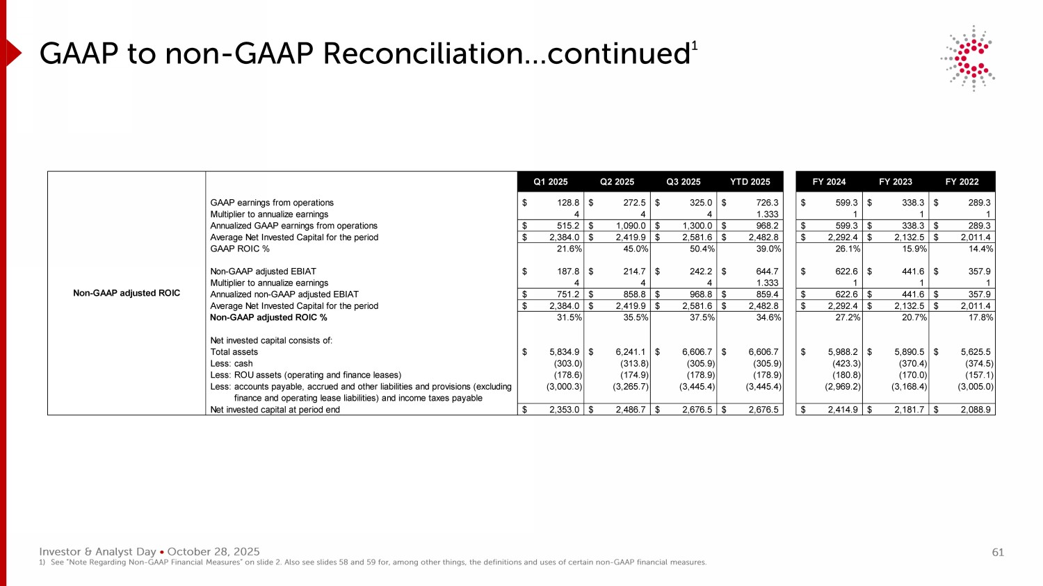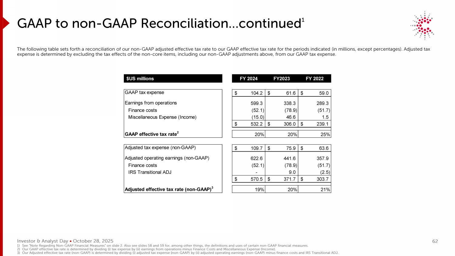 Investor & Analyst Day • October 28, 2025 Q1 2025 Q2 2025 Q3 2025 YTD 2025 FY 2024 FY 2023 FY 2022 GAAP earnings from operations 128.8$ 272.5$ 325.0$ 726.3$ 599.3$ 338.3$ 289.3$ Multiplier to annualize earnings 4 4 4 1.333 1 1 1 Annualized GAAP earnings from operations 515.2$ 1,090.0$ 1,300.0$ 968.2$ 599.3$ 338.3$ 289.3$ Average Net Invested Capital for the period 2,384.0$ 2,419.9$ 2,581.6$ 2,482.8$ 2,292.4$ 2,132.5$ 2,011.4$ GAAP ROIC % 21.6% 45.0% 50.4% 39.0% 26.1% 15.9% 14.4% Non-GAAP adjusted EBIAT 187.8$ 214.7$ 242.2$ 644.7$ 622.6$ 441.6$ 357.9$ Multiplier to annualize earnings 4 4 4 1.333 1 1 1 Annualized non-GAAP adjusted EBIAT 751.2$ 858.8$ 968.8$ 859.4$ 622.6$ 441.6$ 357.9$ Average Net Invested Capital for the period 2,384.0$ 2,419.9$ 2,581.6$ 2,482.8$ 2,292.4$ 2,132.5$ 2,011.4$ Non-GAAP adjusted ROIC % 31.5% 35.5% 37.5% 34.6% 27.2% 20.7% 17.8% Net invested capital consists of: Total assets 5,834.9$ 6,241.1$ 6,606.7$ 6,606.7$ 5,988.2$ 5,890.5$ 5,625.5$ Less: cash (303.0) (313.8) (305.9) (305.9) (423.3) (370.4) (374.5) Less: ROU assets (operating and finance leases) (178.6) (174.9) (178.9) (178.9) (180.8) (170.0) (157.1) Less: accounts payable, accrued and other liabilities and provisions (excluding (3,000.3) (3,265.7) (3,445.4) (3,445.4) (2,969.2) (3,168.4) (3,005.0) finance and operating lease liabilities) and income taxes payable Net invested capital at period end 2,353.0$ 2,486.7$ 2,676.5$ 2,676.5$ 2,414.9$ 2,181.7$ 2,088.9$ Non-GAAP adjusted ROIC GAAP to non - GAAP Reconciliation…continued 1 1) See “Note Regarding Non - GAAP Financial Measures” on slide 2. Also see slides 58 and 59 for, among other things, the definitions and uses of certain non - GAAP financial measures. 61 Investor & Analyst Day • October 28, 2025 GAAP to non - GAAP Reconciliation…continued 1 The following table sets forth a reconciliation of our non - GAAP adjusted effective tax rate to our GAAP effective tax rate for t he periods indicated (in millions, except percentages).