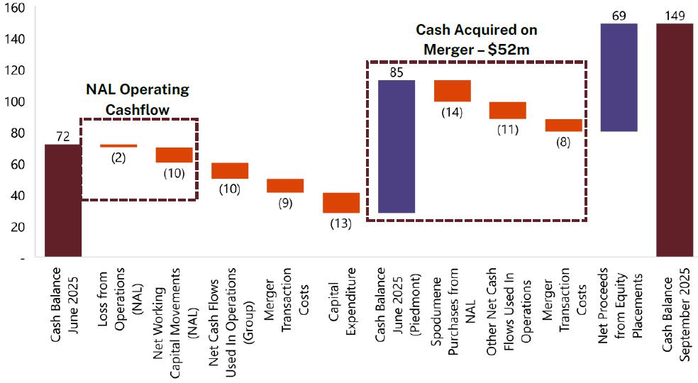 | · | The balance of cash and cash equivalents at 30 September 2025 was $148.8 million, a $76.5 million increase over the equivalent balance of $72.3 million at 30 June 2025. Cash increased due to the receipt of $69 million of proceeds raised through the issuance of new shares and $52 million of cash from Piedmont at merger completion (net of Piedmont expenditure from 1 July to 30 August, which included $8 million of merger transaction costs). This was offset by a $12 million operating cash outflow at NAL, primarily driven by adverse working capital movements from inventory build, $13 million in capital expenditure, $10 million outflow from Group operations, and $9 million of merger transaction costs. |