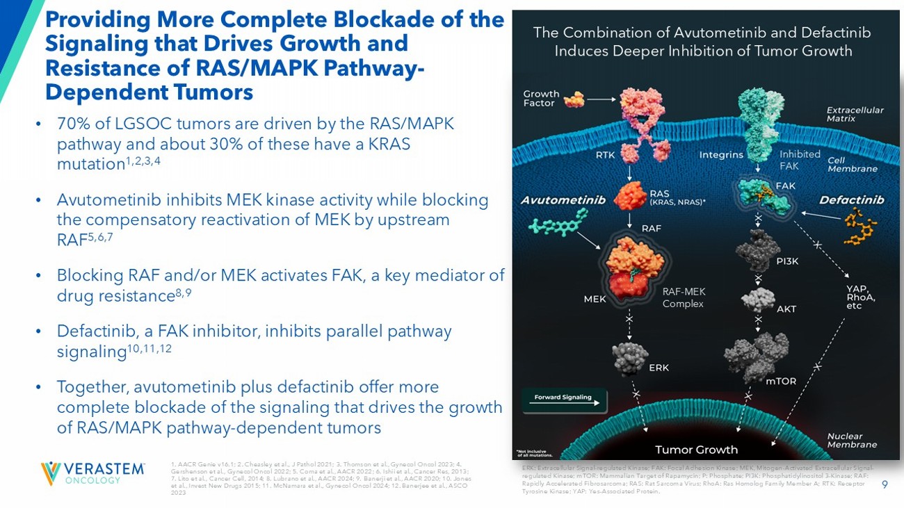 米国食品医薬品局(FDA)は2025年5月8日、AVMAPKI™ FAKZYNJA™ CO-PACK(アフトメチニブカプセル、デファクチニブ錠剤)を、全身療法歴のあるKRAS遺伝子変異再発LGSOC成人患者の治療薬として承認した。本適応症の承認継続には、確認試験における臨床的有用性の検証および記載が条件となる場合があります。ベラステム社は、KRAS遺伝子変異の有無にかかわらず、再発低悪性度漿液性卵巣がん(LGSOC)の治療において、アヴトメチニブとデファクチニブの併用療法を標準化学療法またはホルモン療法と比較評価する国際共同第3相確認試験であるRAMP 301(GOG-3097/ENGOT-ov81/GTG-UK)(NCT06072781)を実施している。ベラステム社はまた、進行膵癌(RAMP 205; NCT05669482)および進行KRAS G12C変異非小細胞肺癌(RAMP 203; NCT05074810)患者に対する潜在的治療法として、アヴトメチニブとデファクチニブおよび他の薬剤との併用療法を評価している。アヴトメチニブおよびデファクチニブは、FDAまたはその他の規制当局から、これらの治験用途について、併用または他の治療法との併用で承認されていません。アヴトメチニブもデファクチニブも、単独ではいかなる用途でもFDAまたはその他の規制当局から承認されていない。