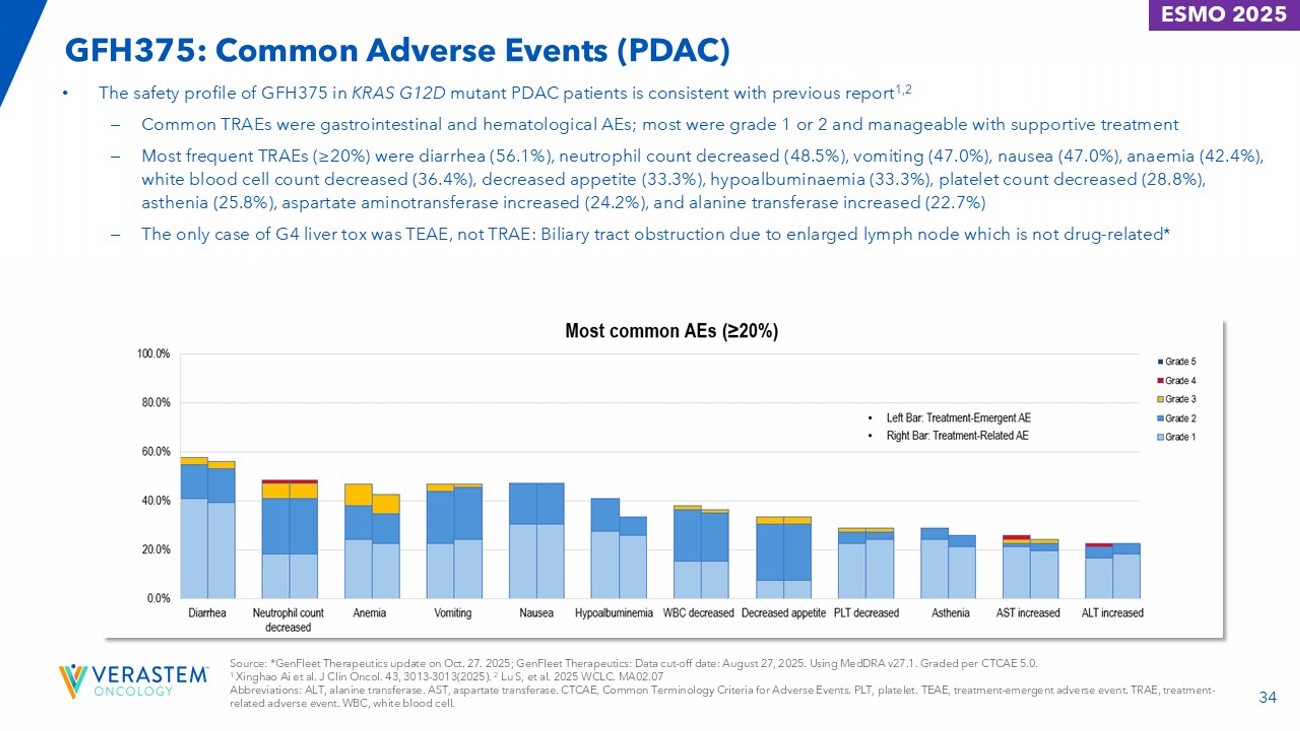 | o | 本試験において、VS-7375は1日400mg(QD)投与および1日600mg(QD)単剤投与のいずれにおいても、用量制限毒性(DLT)は認められず、クリアーした。米国のコホートで評価された2つの用量レベルでは、グレード1を超える悪心、嘔吐、下痢は報告されなかった。さらに、当社のパートナーであるGenFleet Therapeutics社が中国で実施中のVS-7375(通称GFH375)のフェーズ1/2臨床試験において、膵管腺癌(PDAC)および非小細胞肺癌(NSCLC)を対象とした以前のデータと比較して、新たな安全性シグナルは観察されていない。当社の用量漸増試験は、単剤療法である1日900mgの用量レベルでの評価を継続中である。 |