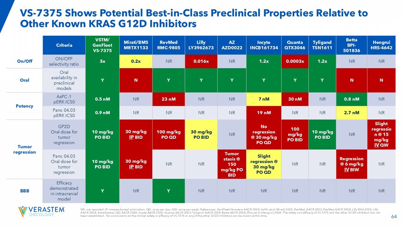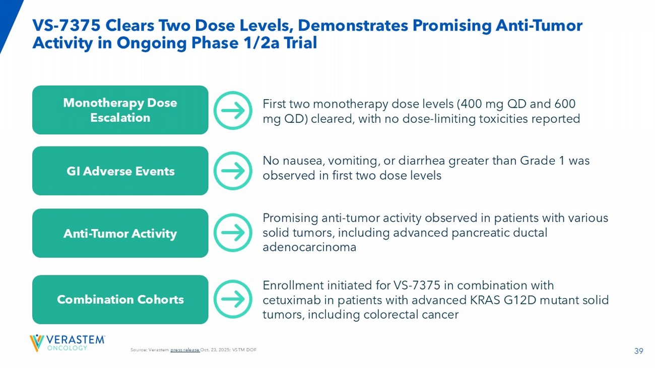 | · | 2025年10月23日、前治療歴のある進行性KRAS G12D変異固形がん患者を対象としたVS-7375単剤療法の用量漸増フェーズ1/2a試験の速報を発表。 |