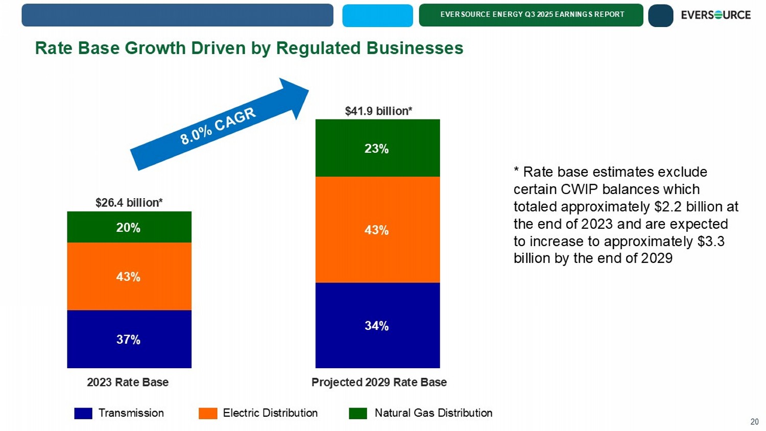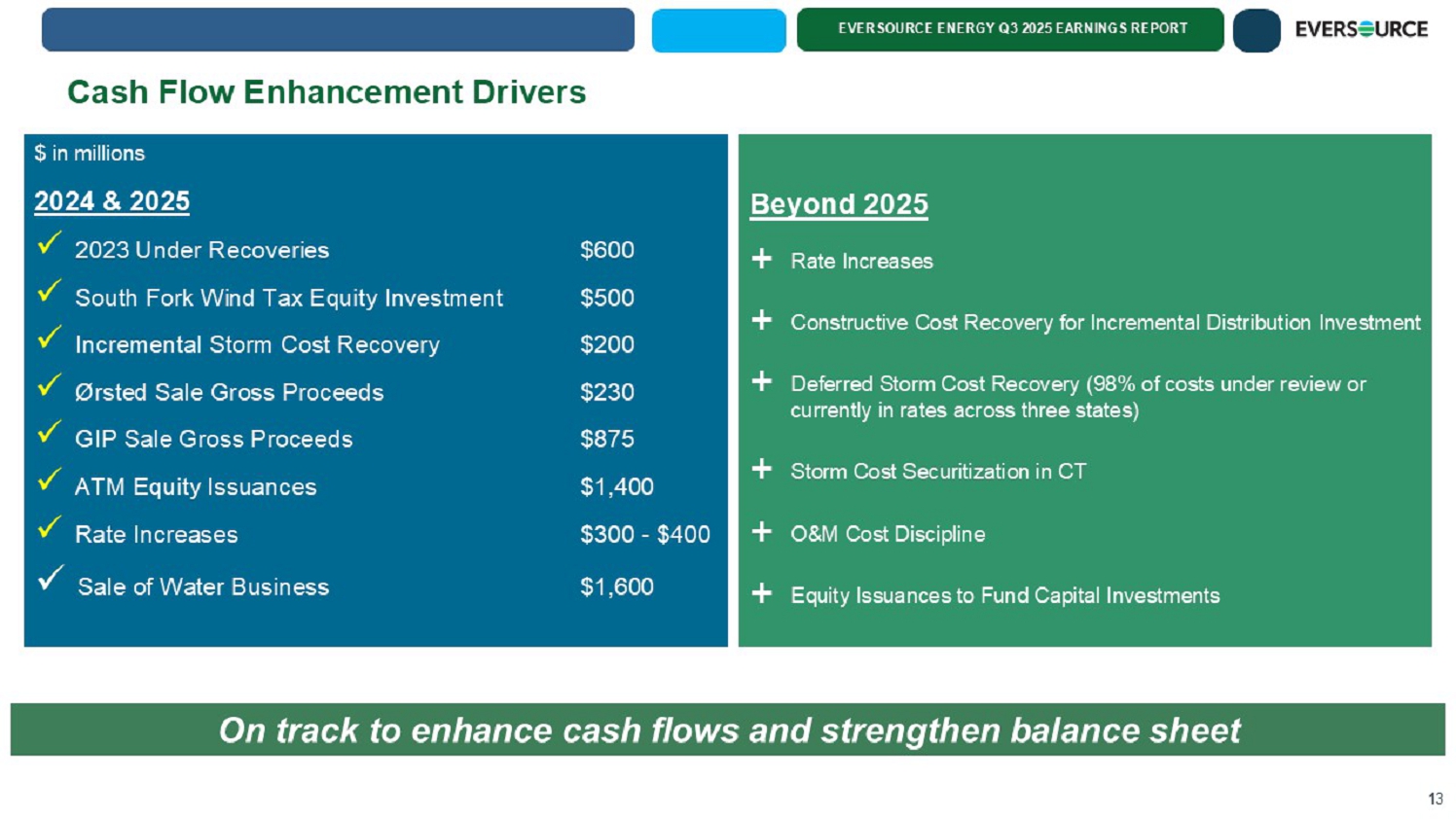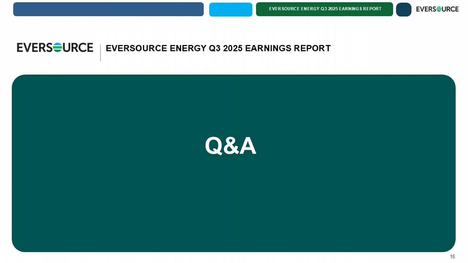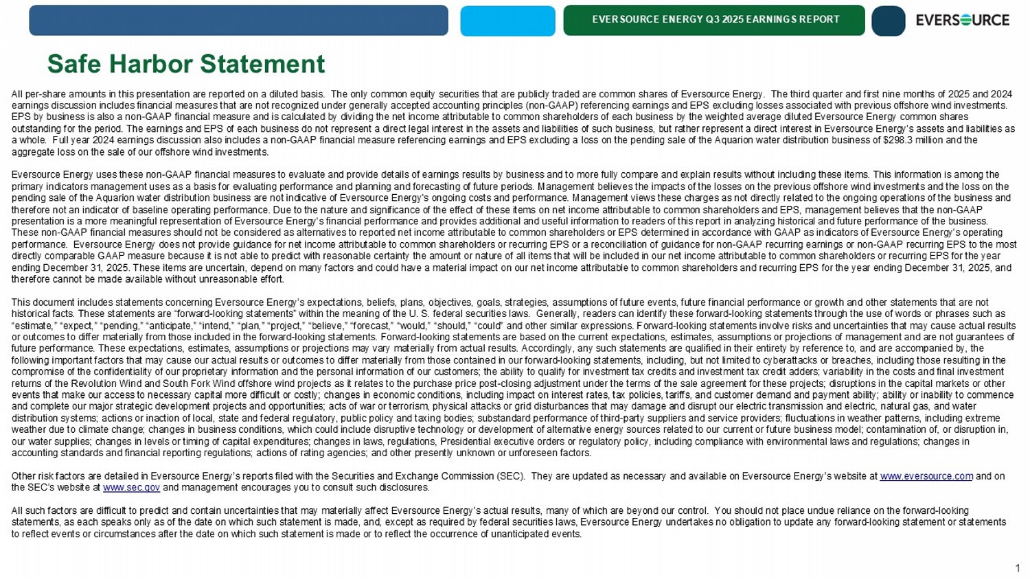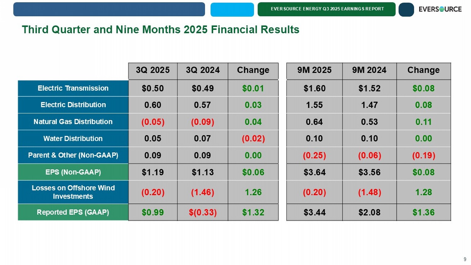 2025年10月14日に発表されたとおり、2025年第3四半期および9ヶ月累計の業績には、2024年9月30日にサウスフォーク・ウィンドおよびレボリューション・ウィンド・プロジェクトの売却の一環として、エバーソース・エナジー社がグローバル・インフラストラクチャ・パートナーズ社に対して将来負うと予想される債務の増加(これらのプロジェクトの売却に伴う税務上の損失に関連する税効果控除後)に関連する税引き後純損失7,500万ドル(両期間とも1株当たり0.20ドル)が含まれています。2024年第3四半期および2024年9ヶ月累計の業績には、エバーソース・エナジー社が洋上風力発電投資の売却を完了したことに関連する税引き後純損失5億2,400万ドル(両期間とも1株当たり1.48ドル)が含まれています。