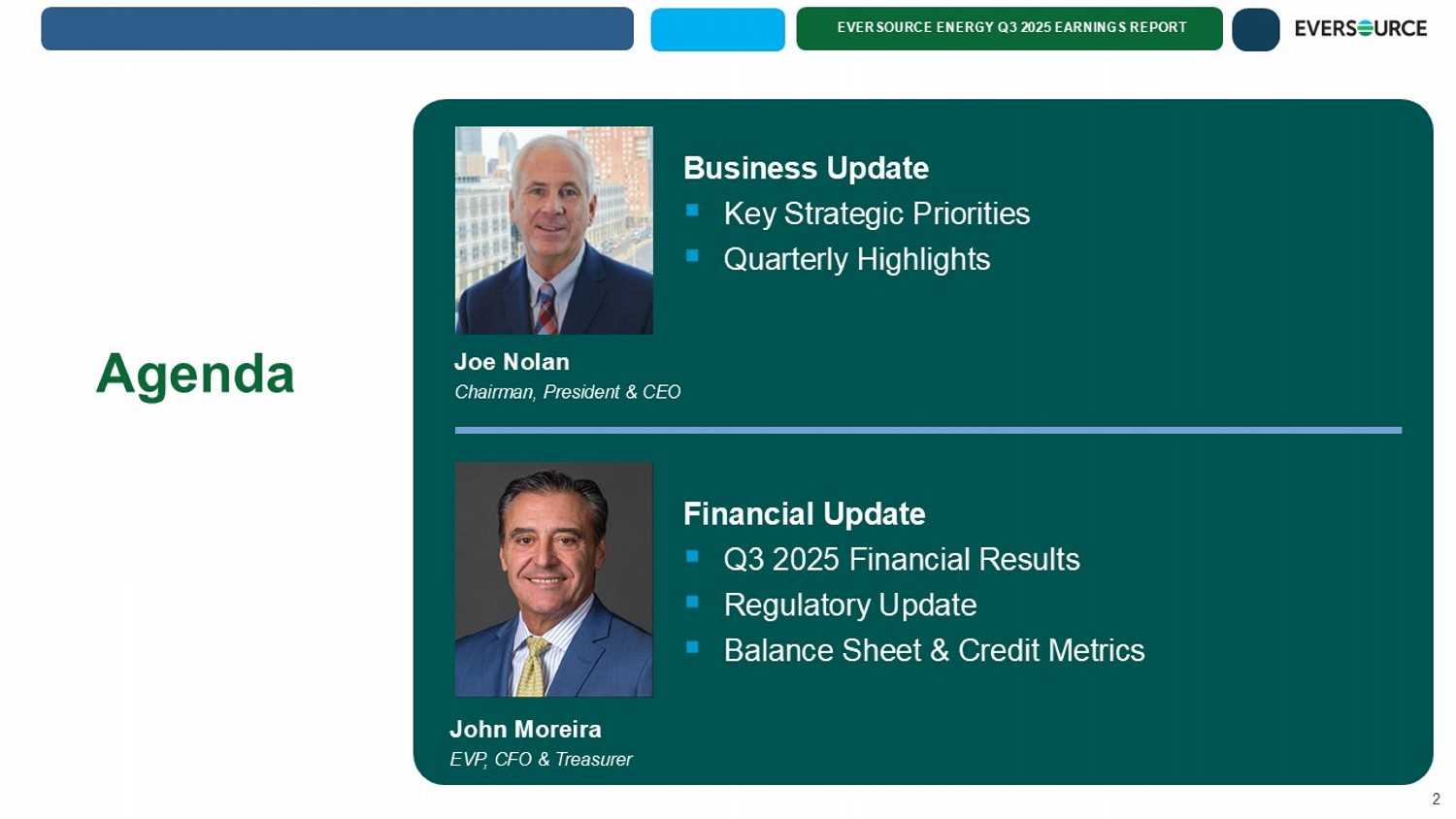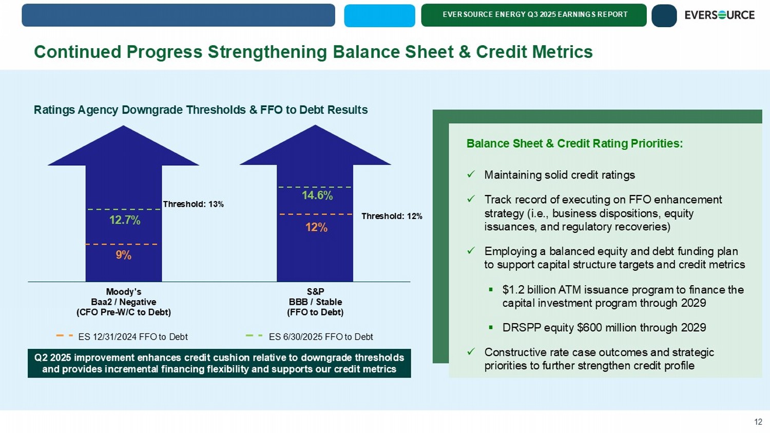 コネチカット州ハートフォードおよびマサチューセッツ州ボストン(2025年11月4日)-エバーソース・エナジー(NYSE: ES)は本日、2025年第3四半期の利益が3億6,750万ドル(1株当たり0.99ドル)となり、これに対し2024年第3四半期は1億1,810万ドル(1株当たり0.33ドル)の損失となったと発表した。非GAAPベースの経常利益は、2024年第3四半期の4億590万ドル1、1株当たり1.13ドル1に対し、2025年第3四半期は4億4,250万ドル1、1株当たり1.19ドル1でした。