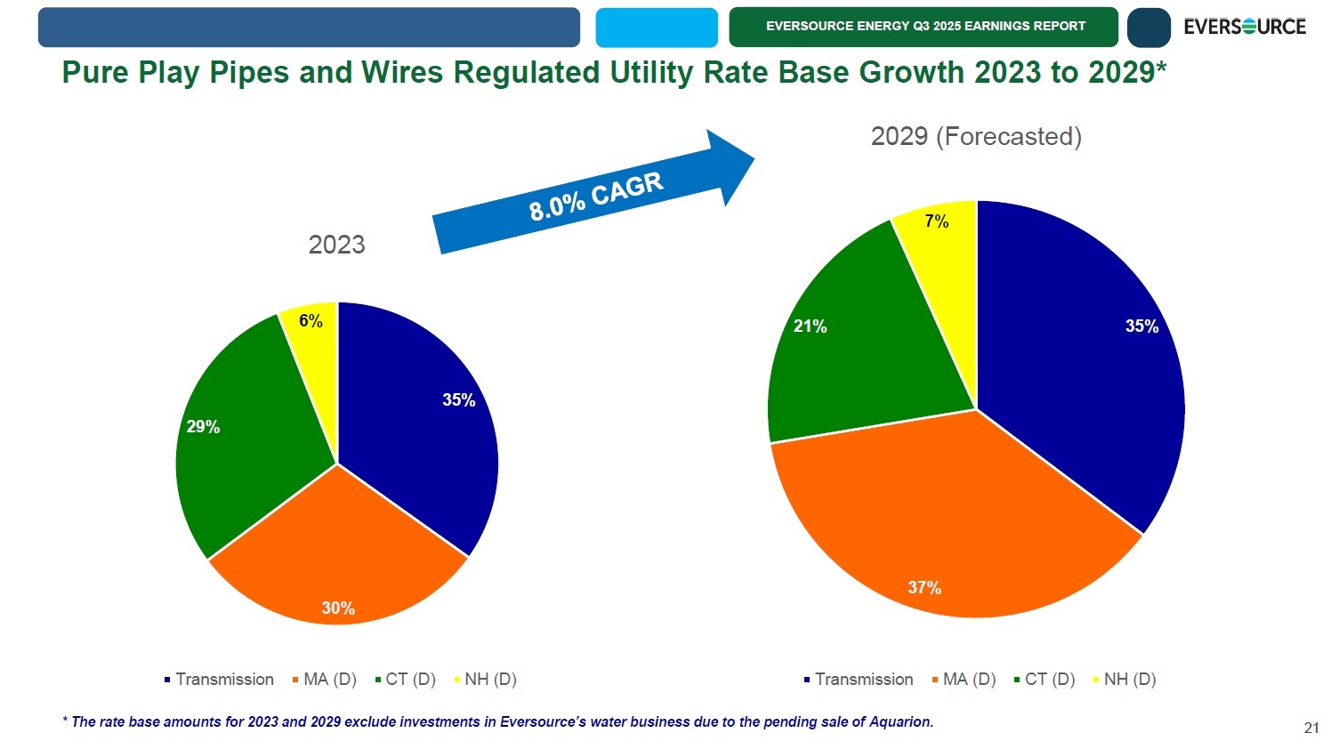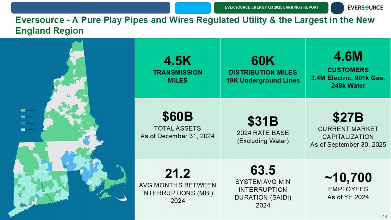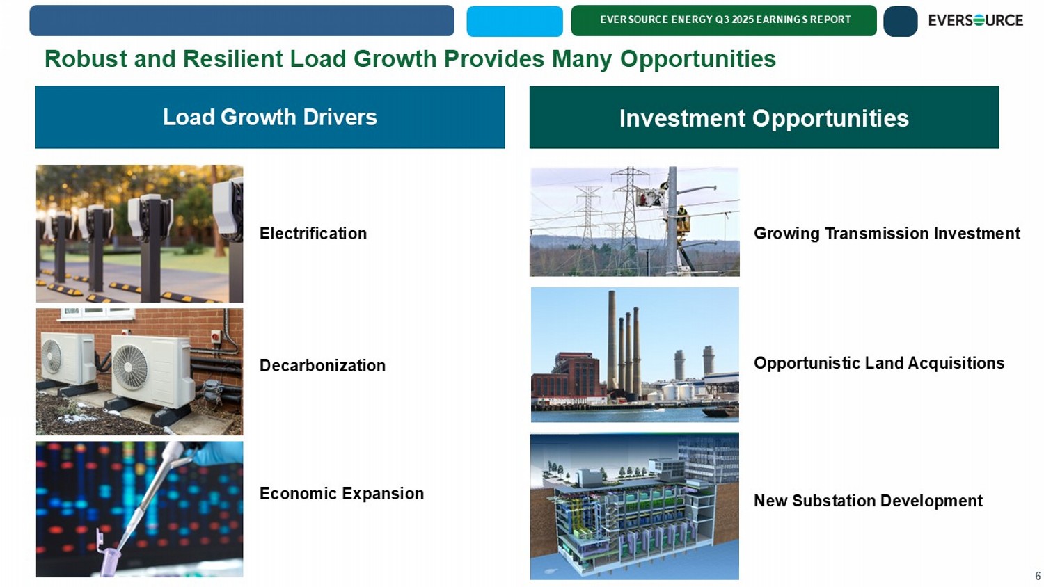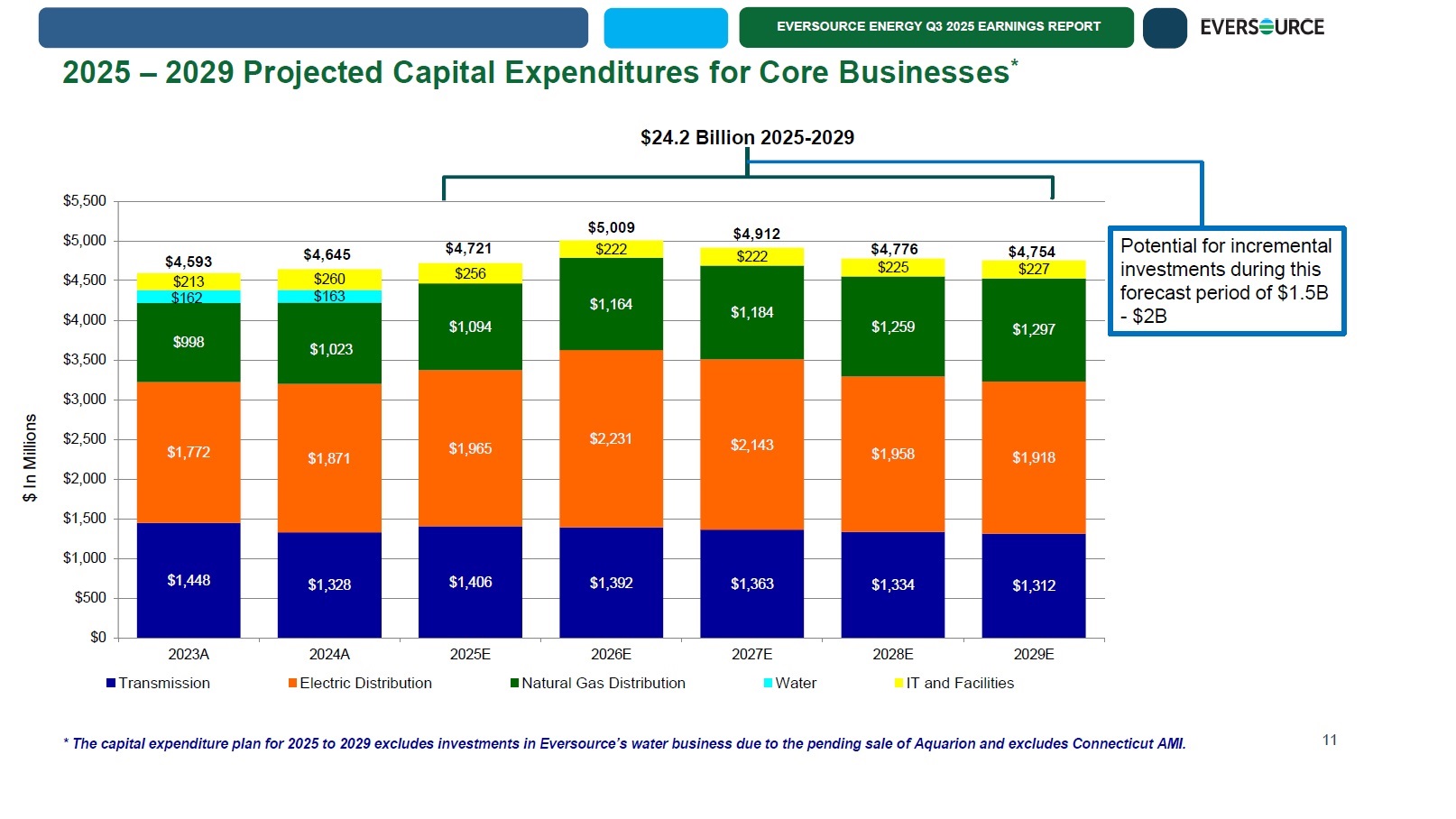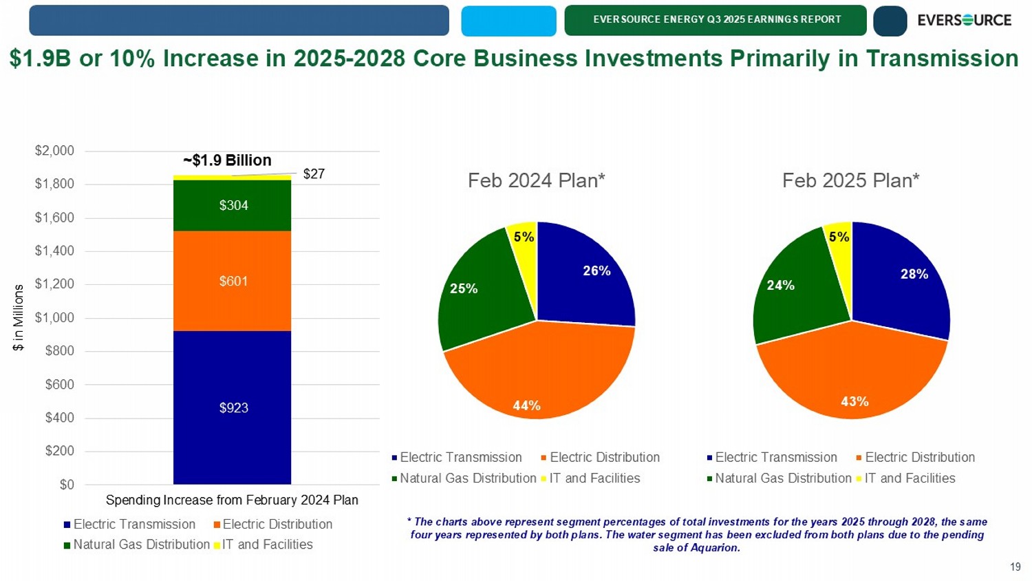 エバーソース・エナジーの送電部門は、2025年第3四半期に1億8,550万ドル、2025年1~9月期に5億9,300万ドルの利益を計上したのに対し、2024年第3四半期は1億7,490万ドル、2024年1~9月期は5億4,060万ドルの利益を計上した。送電部門の業績は、主にエバーソースの送電システムへの継続的な投資により、両期間とも改善しました。