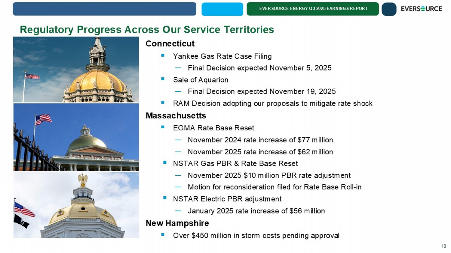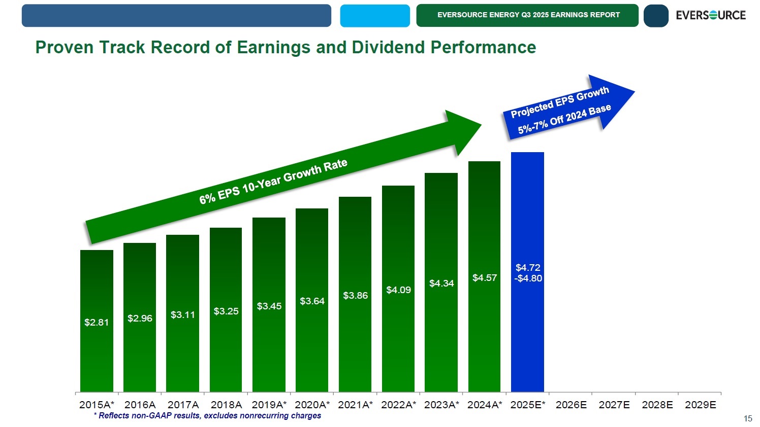 またエバーソース社は10月14日、2025年通年の非GAAPベースの経常利益ガイダンスを1株当たり4.72ドルから4.80ドル1へと引き下げたと発表した。エバーソース社はまた、2024年の1株当たり4.57ドルを基準として、1株当たり年間複合利益成長率を5~7%の範囲内で予想することを再確認した1。