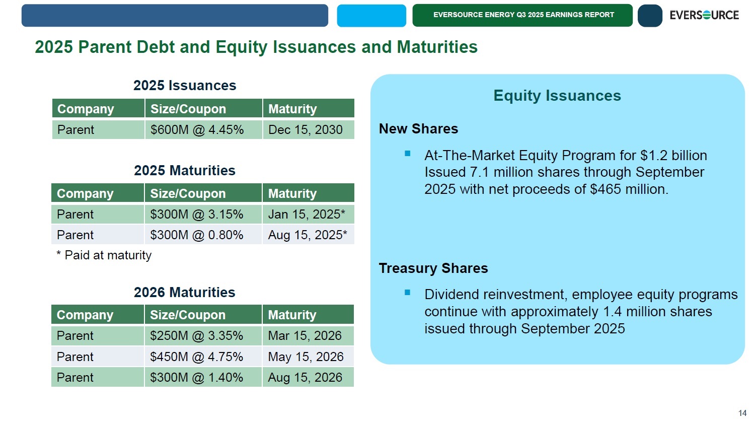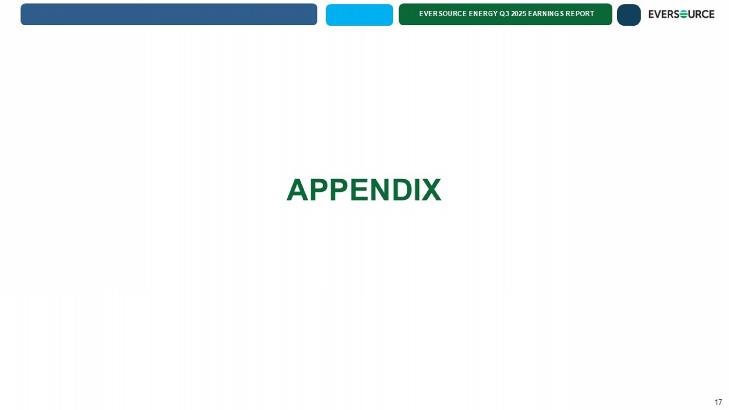 エバーソース・エナジー単体およびその他の会社は、上述の洋上風力発電による純損失を除くと、2025年第3四半期は3,330万ドル1 の利益、2025年1-9月期は(9,220万ドル1) の損失であったのに対し、2024年第3四半期は3,400万ドル1 の利益、2024年1-9月期は(2,330万ドル1) の損失でした。1~9月期の損失拡大は、主に洋上風力発電投資の売却により資産計上された利息がなくなったことによる支払利息の増加によるものですが、実効税率の低下により一部相殺されました。