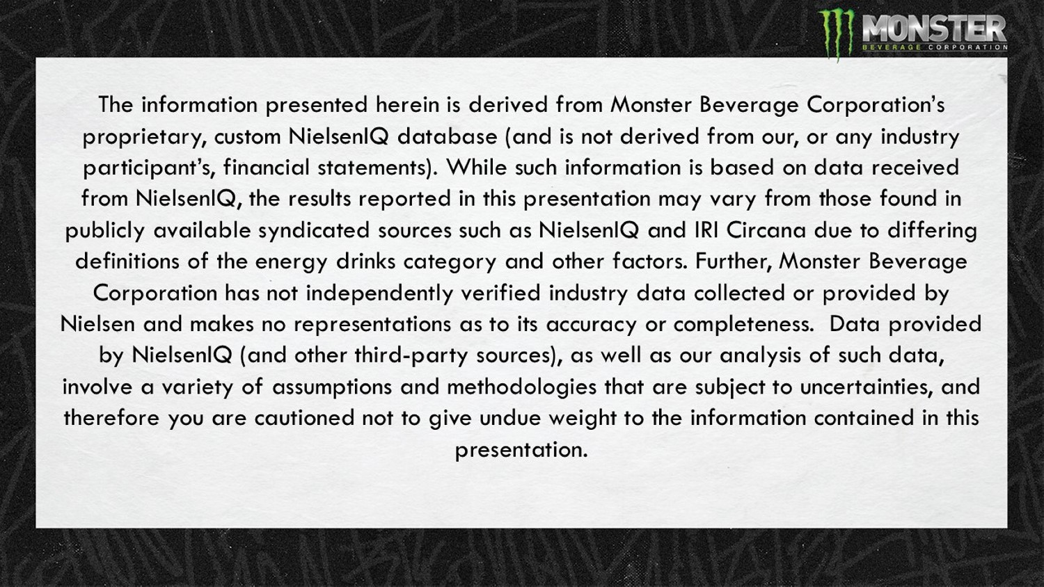 2025年11月6日午後2時(太平洋標準時)より電話会議を開催する。このカンファレンス・コールは、関心をお持ちのすべての投資家の皆様に、インターネットを通じたライブ音声ウェブ放送(www.monsterbevcorp.com、「イベント&プレゼンテーション」セクションでご覧いただけます)を通じて公開されます。ライブ放送をお聞きになれない方のために、電話会議の模様はウェブサイト上で約1年間アーカイブされます。