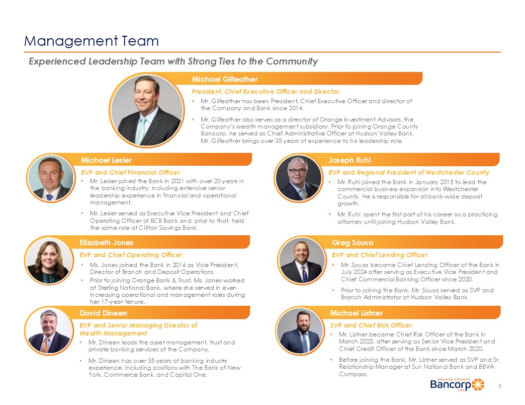 Safe Harbor Statement and Disclaimer Forward - Looking Statements This presentation and any other written or oral statements made by us from time to time may contain forward - looking statements w ithin the meaning of the Private Securities Litigation Reform Act of 1995, which may be identified by the use of such words as “may,” “believe,” “expect,” “anticipate,” “consider,” “should,” “pl an, ” “estimate,” “predict,” “continue,” “probable,” and “potential” or the negative of these terms or other comparable terminology. These statements include statements with respect to the Company, Or ange Bank & Trust Company (the “Bank”) and Orange Investment Advisors, Inc. (“OIA”) and our strategies, plans, objectives, expectations and intentions and other statements in thi s presentation. These statements are not guarantees of future performance and are subject to risks, uncertainties and other factors (many of which are beyond the Company’s control) that c oul d cause actual results to differ materially from future results expressed or implied by such forward - looking statements. For more information about factors that could cause actual results to d iffer from those discussed in the forward - looking statements, please refer to the “Risk Factors” and “Management's Discussion and Analysis of Financial Condition and Results of Operations” secti ons of and the forward - looking statement disclaimers in the Company’s annual and quarterly reports filed with the SEC. All forward - looking statements are subject to risks, uncertainties and other factors that may cause the actual results, performa nce or achievements of the Company to differ materially from any results expressed or implied by such forward - looking statements. Such factors include, among others: (i) general economic conditions, ei ther nationally or in our market areas, that are worse than expected; (ii) changes in the level and direction of loan delinquencies and write - offs and changes in estimates of the adequacy of the all owance for credit losses; (iii) our ability to access cost - effective funding; (iv) fluctuations in real estate values and both residential and commercial real estate market conditions; (v) deman d f or loans and deposits in our market area; (vi) our ability to implement and change our business strategies; (vii) competition among depository and other financial institutions; (viii) inflation, ta rif fs, recession, and changes in the interest rate environment that reduce our margins or reduce the fair value of financial instruments; (ix) the effects of any turmoil or negative news in the banking in dus try; (x) the rate of delinquencies and amounts of loans charged - off; (xi) fluctuations in real estate values and both residential and commercial real estate market conditions; (xii) adverse changes i n t he securities markets; (xiii) fluctuations in the stock market, including those that may have an adverse effect on transaction fees, client activity and client investment portfolio gains and losses r ela ted to our trust and wealth management business; (xiv) changes in laws or government regulations or policies affecting financial institutions, including changes in regulatory fees and capital requ ire ments; (xv) our ability to enter new markets successfully and capitalize on growth opportunities; (xvi) our ability to capitalize on strategic opportunities; (xvii) our ability to successfully introduc e n ew products and services; (xviii) our ability to successfully integrate into our operations any assets, liabilities, customers, systems and management personnel we may acquire and our ability to realize rel ate d revenue synergies and cost savings within expected time frames, and any goodwill charges related thereto; (xix) our ability to retain our existing customers; (xx) our ability to prevent or mit igate fraudulent activity; (xxi) changes in consumer spending, borrowing and savings habits; (xxii) changes in accounting policies and practices, as may be adopted by the bank regulatory agencies, the F ina ncial Accounting Standards Board, the Securities and Exchange Commission or the Public Company Accounting Oversight Board; (xxiii) changes in our organization, compensation and benefit pl ans ; (xxiv) changes in the quality or composition of our loan or investment portfolios; (xxv) a breach in security of our information systems, including the occurrence of a cyber incident or a deficiency in cyber security; (xxvi) political instability or civil unrest; (xxvii) acts of war or terrorism or pandemics; (xxviii) competition and innovation with respect to financial products and services by ba nks, financial institutions and non - traditional providers, including retail businesses and technology companies; (xxix) the failure to attract and retain skilled people; (xxx) the fiscal and monetary p oli cies of the federal government and its agencies; (xxxi) any future FDIC insurance premium increases, or special assessment may adversely affect our earnings; and (xxxii) other economic, competitive , g overnmental, regulatory and operational factors affecting our operations. Industry Information This presentation includes statistical and other industry and market data that we obtained from government reports and other thi rd - party sources. Our internal data, estimates, and forecasts are based on information obtained from government reports, trade and business organizations and other contacts in the markets in whi ch we operate and our management’s understanding of industry conditions. Although we believe that this information (including the industry publications and third party research, surveys, an d studies) is accurate and reliable, we have not independently verified such information. In addition, estimates, forecasts and assumptions are necessarily subject to a high degree of uncertainty a nd risk due to a variety of factors. Finally, forward - looking 
