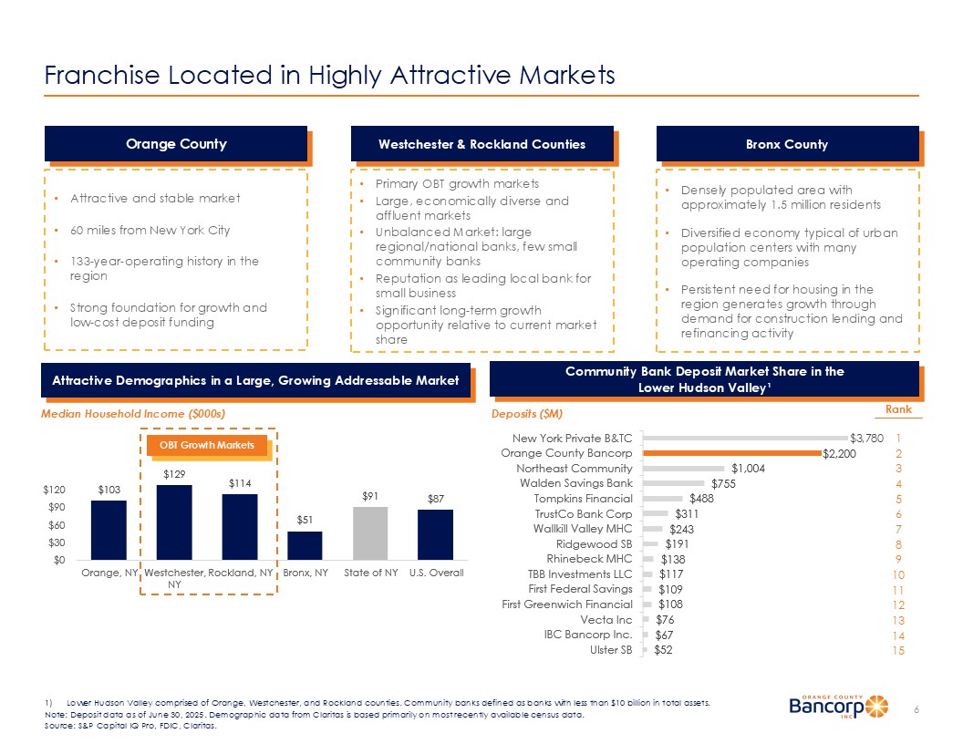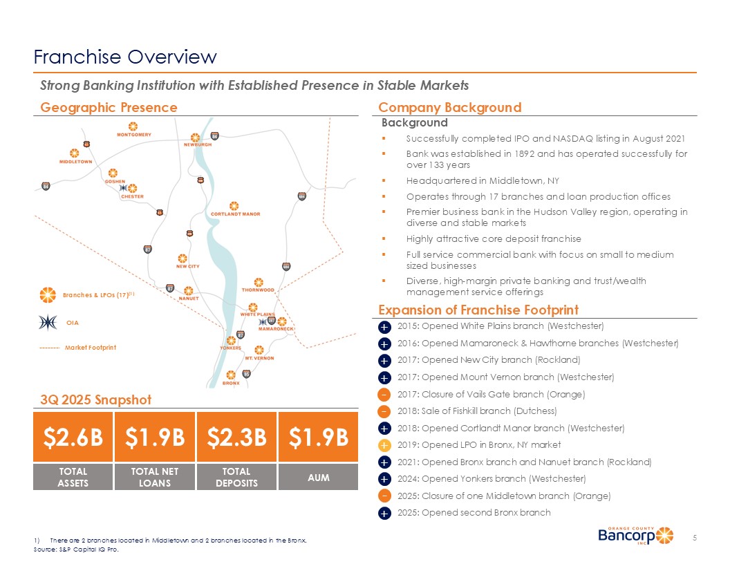 Source: S&P Capital IQ Pro. Background ▪ Successfully completed IPO and NASDAQ listing in August 2021 ▪ Bank was established in 1892 and has operated successfully for over 133 years ▪ Headquartered in Middletown, NY ▪ Operates through 17 branches and loan production offices ▪ Premier business bank in the Hudson Valley region, operating in diverse and stable markets ▪ Highly attractive core deposit franchise ▪ Full service commercial bank with focus on small to medium sized businesses ▪ Diverse, high - margin private banking and trust/wealth management service offerings Strong Banking Institution with Established Presence in Stable Markets Geographic Presence $1.9B TOTAL NET LOANS Company Background 3Q 2025 Snapshot - + + + + + + + - - 2015: Opened White Plains branch (Westchester) 2016: Opened Mamaroneck & Hawthorne branches (Westchester) 2017: Opened New City branch (Rockland) 2017: Opened Mount Vernon branch (Westchester) 2017: Closure of Vails Gate branch (Orange) 2018: Sale of Fishkill branch (Dutchess) 2018: Opened Cortlandt Manor branch (Westchester) 2019: Opened LPO in Bronx, NY market 2021: Opened Bronx branch and Nanuet branch (Rockland) 2024: Opened Yonkers branch (Westchester) 2025: Closure of one Middletown branch (Orange) 2025: Opened second Bronx branch Branches & LPOs (17) (1) Market Footprint Expansion of Franchise Footprint OIA + $2.3B TOTAL DEPOSITS $2.6B TOTAL ASSETS $1.9B AUM + 1HZ<RUN 3ULYDWH % 7& 2UDQJH ;&RXQW\%DQFRUS 1RUWKHDVW&RPPXQLW\ :DOGHQ6DYLQJV%DQN 7RPSNLQV)LQDQFLDO 7UXVW&R%DQN&RUS :DOONLOO9DOOH\0+& 5LGJHZRRG6% 5KLQHEHFN0+& 7%%,QYHVWPHQWV//& )LUVW)HGHUDO6DYLQJV )LUVW*UHHQZLFK)LQDQFLDO 9HFWD,QF ,%&%DQFRUS,QF 8OVWHU6% Franchise Located in Highly Attractive Markets 6 Attractive Demographics in a Large, Growing Addressable Market Median Household Income ($000s) 1) Lower Hudson Valley comprised of Orange, Westchester, and Rockland counties.