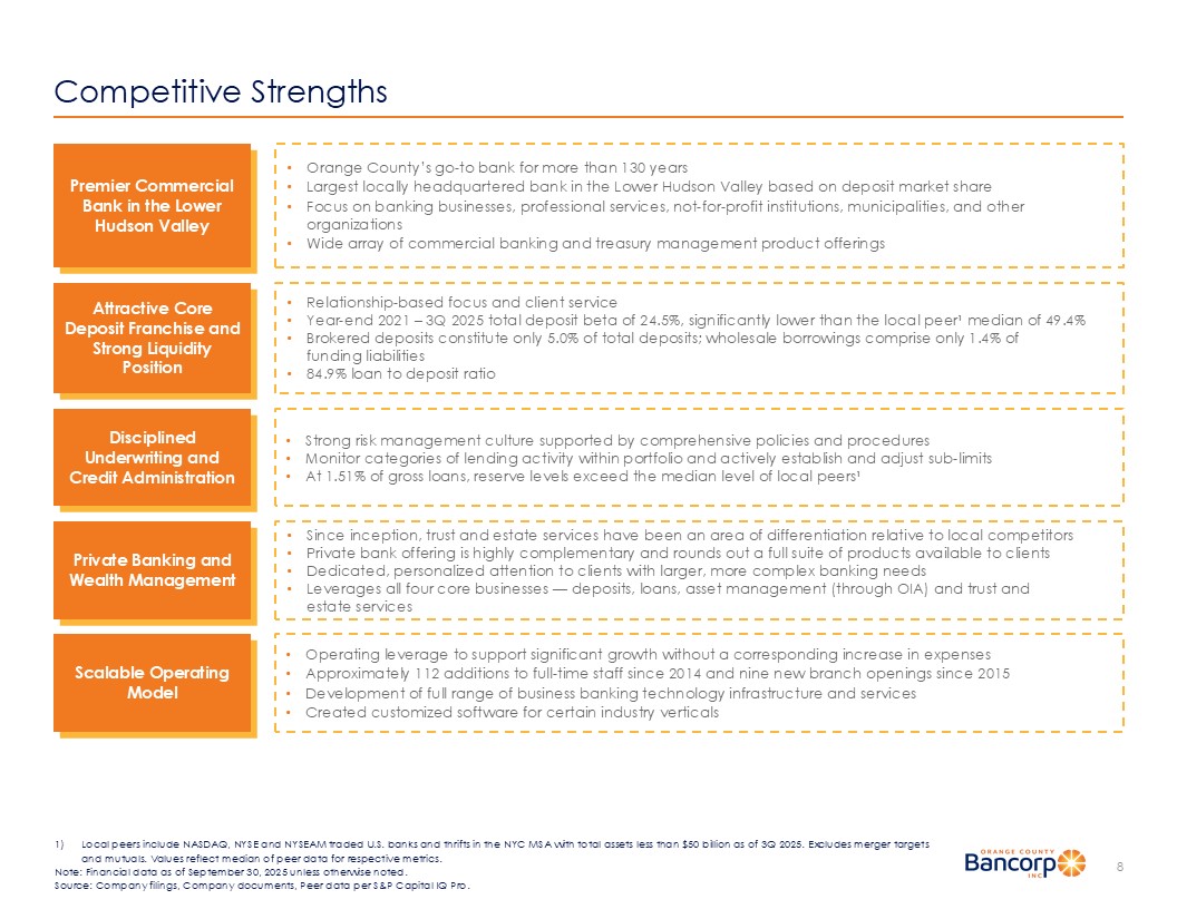 Community banks defined as banks with less than $10 billion in total assets. Note: Deposit data as of June 30, 2025. Demographic data from Claritas is based primarily on most recently available census d ata . Source: S&P Capital IQ Pro, FDIC, Claritas . 2UDQJH 1< :HVWFKHVWHU 1< 5RFNODQG 1< %URQ[ 1< 6WDWHRI1< 8 6 2YHUDOO OBT Growth Markets Orange County Westchester & Rockland Counties Bronx County • Attractive and stable market • 60 miles from New York City • 133 - year - operating history in the region • Strong foundation for growth and low - cost deposit funding • Primary OBT growth markets • Large, economically diverse and affluent markets • Unbalanced Market: large regional/national banks, few small community banks • Reputation as leading local bank for small business • Significant long - term growth opportunity relative to current market share • Densely populated area with approximately 1.5 million residents • Diversified economy typical of urban population centers with many operating companies • Persistent need for housing in the region generates growth through demand for construction lending and refinancing activity Community Bank Deposit Market Share in the Lower Hudson Valley¹ Deposits ($M) Rank 1 2 3 4 5 6 7 8 9 10 11 12 13 14 15 $3,780 Structure & Scope Balanced, Client - Driven Business Model 7 Business Banking Orange Wealth Management • 17 branches and LPOs • Focus on small to medium size businesses, professionals, and non - profit entities in the communities served • Seasoned lenders with significant regional and industry expertise • Comprehensive product offering • Full treasury management suite Key Metrics $1.9 billion net loans $2.3 billion deposits • Launched in mid 2017 • Division of Orange Bank & Trust • Client - driven service linking our four primary product areas 1) Deposits with Cash Management / Treasury Services 2) Investment Advisory Services (through OIA) 3) Trust, Estate and Custody Services 4) Loans (Commercial and/or Residential) Approximately 700 Clients • Subsidiary of Orange County Bancorp, Inc. • Acquired in late 2012 from Sterling Bancorp • SEC registered Investment Advisor $1.9 billion AUM • Founding division of the Bank • Traditional trust & administration services to local clients • Niche focus on Special Needs Trust and Guardianship services Note: Key metrics as of September 30, 2025. Source: Company documents. Client - Driven Service Unifies Three Unique Product Areas Private Banking