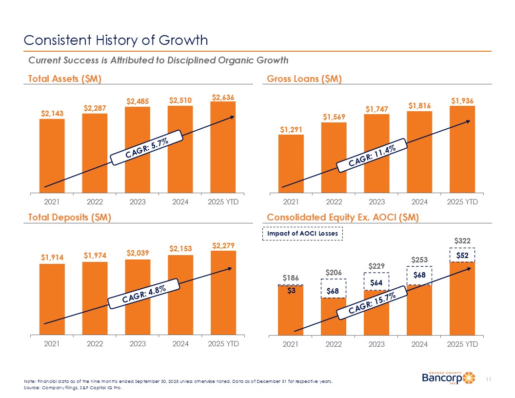 Course: Company filings, S&P Capital IQ Pro. Leverage Relationships to Drive Organic Growth Derive Loan Growth Through Relationship - Based Model Continue to Grow Core Deposit Franchise Continue to Build Fee - Based Business Strategic Expansion / Opportunistic M&A • Seek trusted advisor role with clients as they build their businesses with the Bank’s resources and support • The Bank’s historical success has been closely tied to that of its clients and the communities it serves • Majority of loan growth comes from existing clients and referrals • Direct access to senior management offers customers quicker response time on loan applications and other transactions • Differentiated level of service provides a pricing advantage, often resulting in higher loan rates • Core deposits (which includes all deposits except certificates of deposit) comprise 95.0% of total funding, attributed to the Bank’s long - standing relationships with clients • Cash management has helped the Bank expand depth and efficiency of deposit product offerings • By continuing to broaden its suite of business services, deposits and loans grew 6.5% and 7.8% year over year as of 3Q 2025, respectively • Strategic Expansion: Ongoing investments in Rockland, Westchester and Bronx Counties continue to be significant drivers of growth & profitability • Capitalize on Market Disruption: Consolidation from the sales/mergers of Signature Bank, The Westchester Bank, Sterling National Bank, Hudson Valley Bank, Hometown Bank, Greater Hudson Bank, Catskill Hudson Bank and PCSB Bank presents opportunities to hire seasoned bankers and capture market share • Opportunistic M&A: Could include fee - based business, whole bank or branch acquisitions that would improve market position in geographies with attractive demographics • Having recently reached $1.9 billion in combined AUM in 3Q 2025, the Company’s trust and advisory services businesses provide a strong foundation of fee - based revenue • Company intends to further expand OIA’s services into Westchester and Rockland counties • Private Banking service enables approximately 700 clients to leverage the resources of the platform <7' <7' Transformation, Significant Growth and Expansion 10 Significant Investments in People, Systems and Footprint Expansion… … Has Led to Enhanced Profitability and Peer Outperformance FTE Count Best in Class Profitability Return on Average Assets (%) Noninterest Expense ($M) 1) Non - GAAP financial metric.