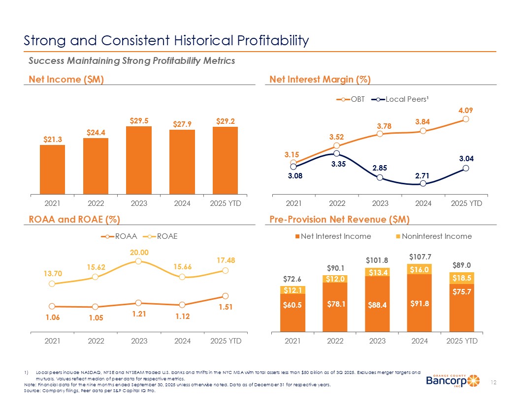 See slides 29 and 30 for applicable reconciliation. 2) Bank level Call Report data. 3) Local peers include NASDAQ, NYSE and NYSEAM traded U.S. banks and thrifts in the NYC MSA with total assets less than $50 billion as of 3Q 2025. Excludes merger targets and mutuals. Values reflect median of peer data for respective metrics. <7' 2%7 /RFDO3HHUV ó Profitability 4.09% NIM 1.51% ROAA 17.48% ROAE 55.70% Efficiency Ratio¹ 10.04% TCE / TA¹ 12.31% Tier 1 Leverage² (Bank Level) 16.77% Tier 1 Capital Ratio² (Bank Level) 18.02% Total Capital Ratio² (Bank Level) 0.15% NCOs / Average Loans 0.46% NPAs / Assets 1.51% Loan Loss Reserves / Gross Loans Regulatory Capital Asset Quality September 30, 2025 Financial Snapshot Note: Financial data as of or for the nine months ended September 30, 2025 unless otherwise noted. Data as of December 31 for respective years. Source: S&P Capital IQ Pro, Company filings, Peer data per S&P Capital IQ Pro. Return on Average Equity (%) <7' 2%7 /RFDO3HHUV ó <7' <7' <7' <7' Consistent History of Growth 11 Note: Financial data as of the nine months ended September 30, 2025 unless otherwise noted.