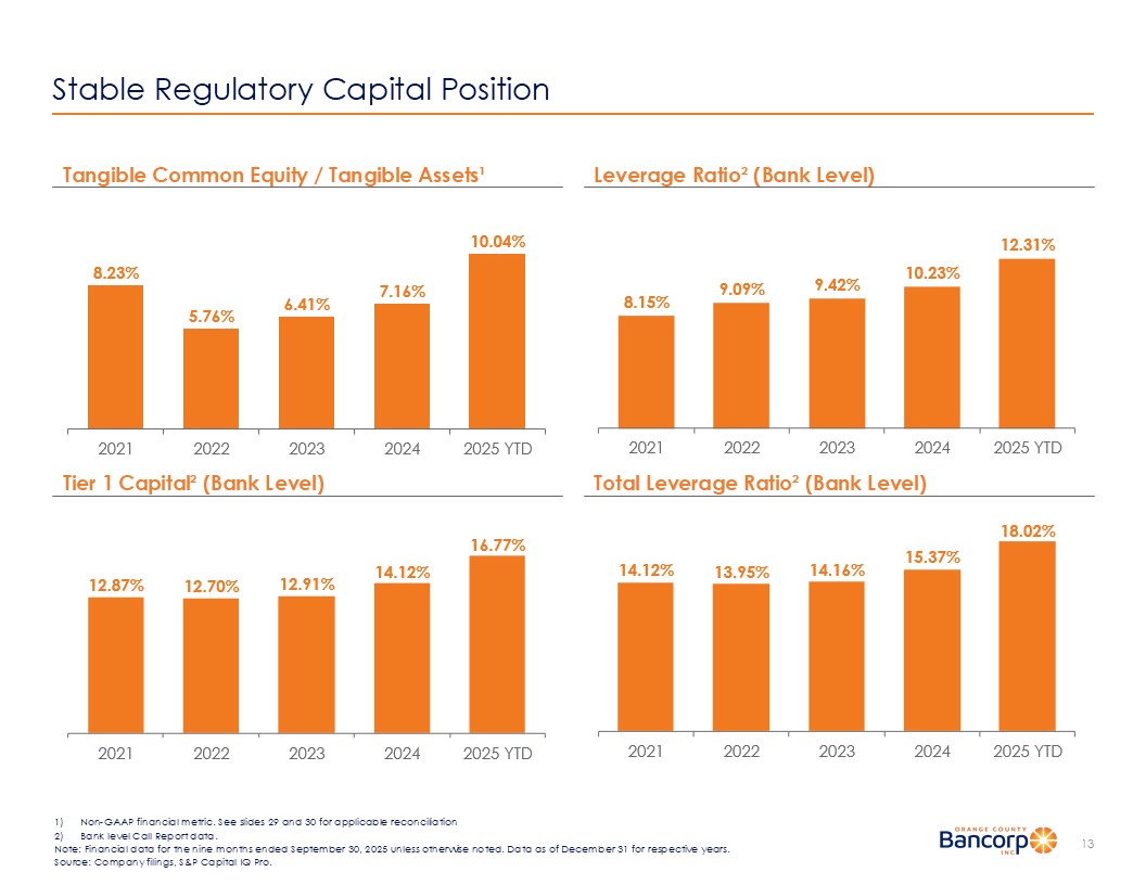 See slides 29 and 30 for applicable reconciliation 2) Bank level Call Report data. Note: Financial data for the nine months ended September 30, 2025 unless otherwise noted. Data as of December 31 for respecti ve years. Source: Company filings, S&P Capital IQ Pro. Leverage Ratio² (Bank Level) Tangible Common Equity / Tangible Assets¹ Total Leverage Ratio² (Bank Level) Tier 1 Capital² (Bank Level)
