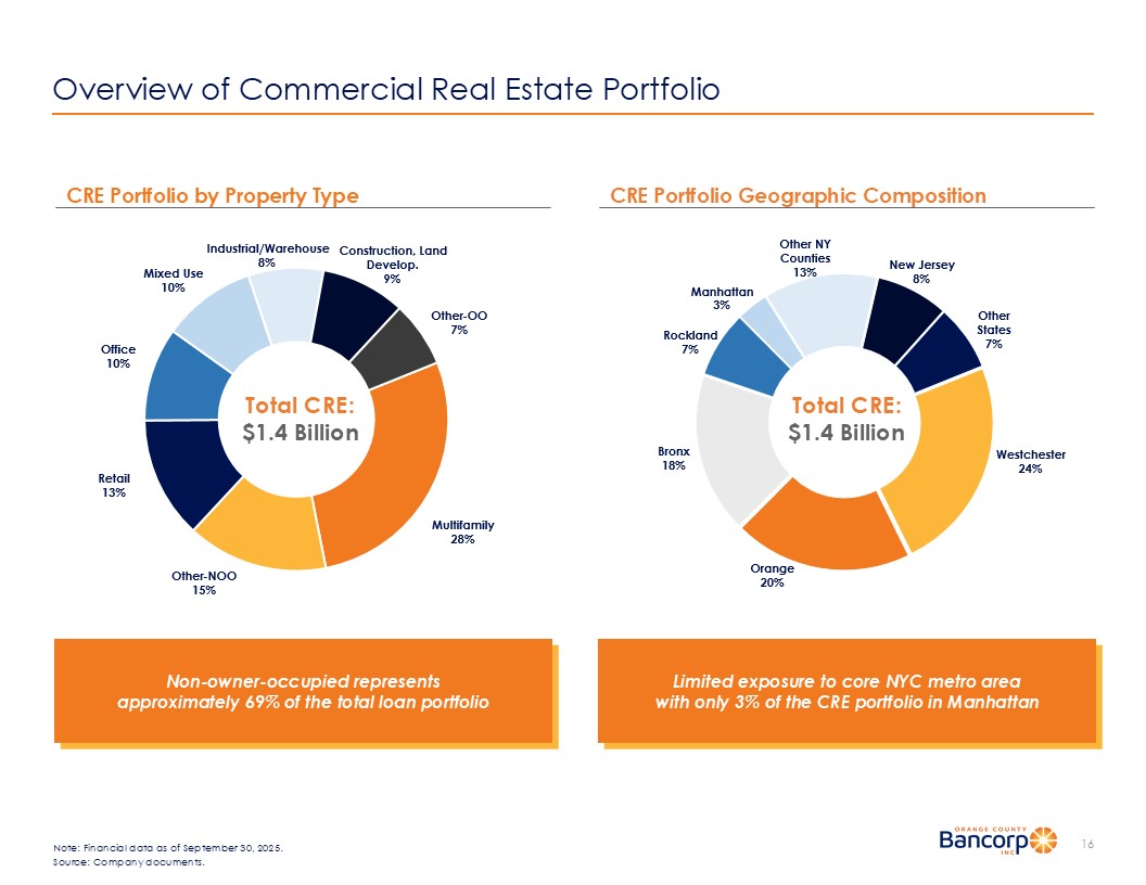 :HVWFKHVWHU 2UDQJH %URQ[ 2WKHU1< &RXQWLHV 2WKHU 5RFNODQG 1HZ-HUVH\ 0DQKDWWDQ &5( & , &5( &RQVWUXFWLRQ 5HVLGHQWLDO5( +RPH(TXLW\ &RQVXPHU Loan Composition 15 1) CRE and CRE Construction loans as a % of Total Risk - Based Capital. Reflects bank level Call Report data. 2) Reflects weighted average yield on loans for the nine months ended September 30, 2025, annualized. Note: Financial data as of September 30, 2025. Source: Company filings, Company documents. Total Loans: $1.9 Billion Commercial - Focused Portfolio with Conservative Concentrations ▪ Advantageous, relationship - based lending model through existing clients and referrals ▪ Syndicated loans represent less than 1.0% of total loans ▪ Purchased loan participations represent 4.7% of total loans ▪ Majority of lending occurs within market; ~90% of real estate secured loans are in market as of September 30, 2025 ▪ $489.9 million (or 25.4%) of loans are repricing or maturing within one year or less ▪ $1.8 billion (or 95.5%) of loans are repricing or maturing within five years Geographic Composition of RE Secured Loans Loan Portfolio Commentary 6.04% Yield on Loans² 374% CRE Concentration¹ (% of Risked - Based Capital) 36% CRE Construction Concentration¹ (% of Risked - Based Capital)