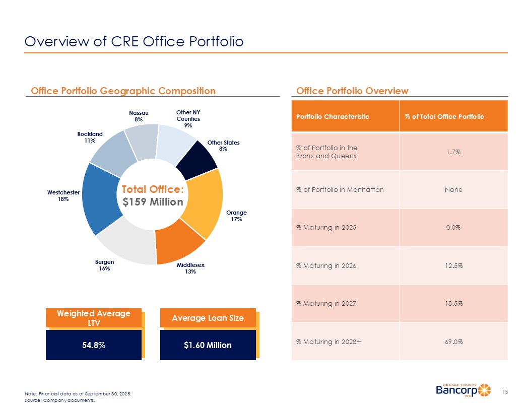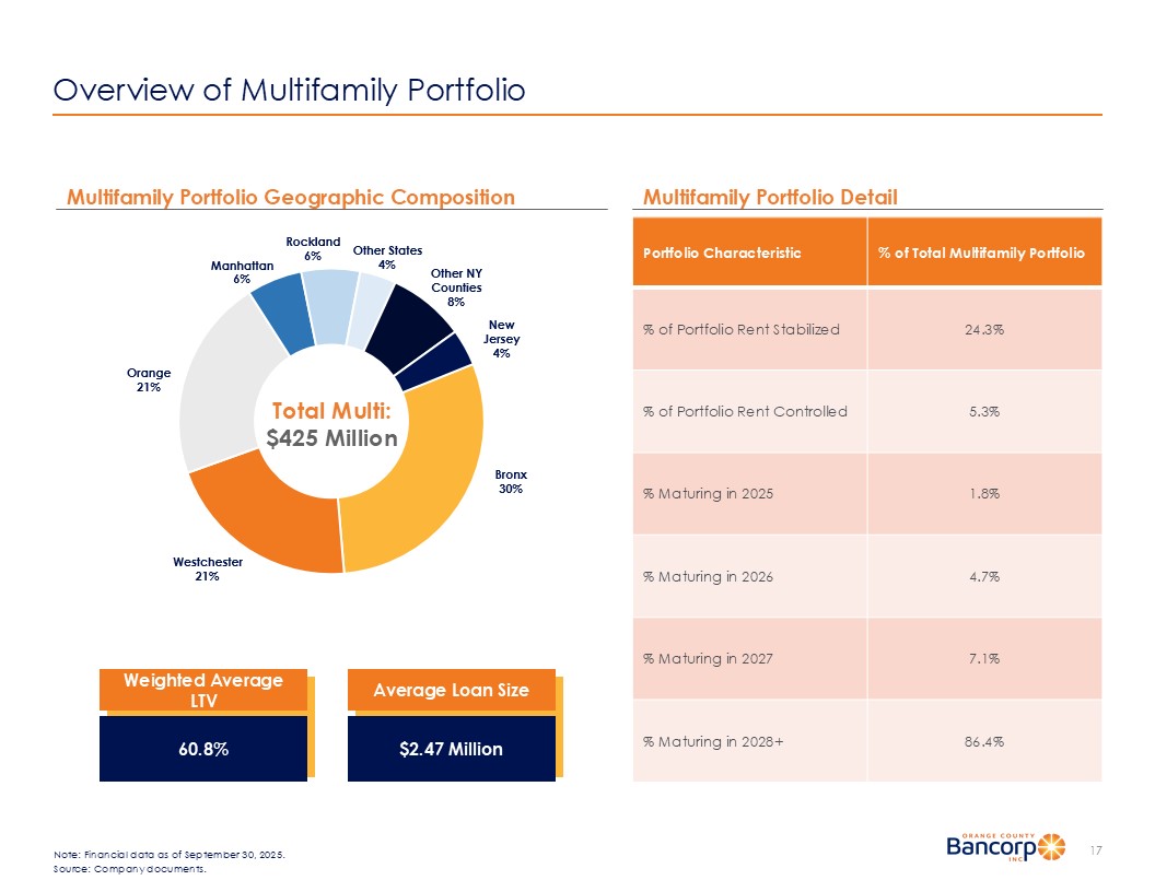 0XOWLIDPLO\ 2WKHU 122 5HWDLO 2IILFH 0L[HG8VH ,QGXVWULDO :DUHKRXVH &RQVWUXFWLRQ /DQG 'HYHORS 2WKHU 22 Overview of Commercial Real Estate Portfolio 16 Note: Financial data as of September 30, 2025. Source: Company documents. CRE Portfolio Geographic Composition CRE Portfolio by Property Type :HVWFKHVWHU 2UDQJH %URQ[ 5RFNODQG 0DQKDWWDQ 2WKHU1< &RXQWLHV 1HZ-HUVH\ 2WKHU 6WDWHV Total CRE: $1.4 Billion Total CRE: $1.4 Billion Limited exposure to core NYC metro area with only 3% of the CRE portfolio in Manhattan Non - owner - occupied represents approximately 69% of the total loan portfolio Overview of Multifamily Portfolio 17 Note: Financial data as of September 30, 2025.
