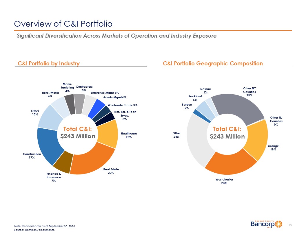 Source: Company documents. Multifamily Portfolio Detail Multifamily Portfolio Geographic Composition Weighted Average LTV 60.8% Average Loan Size $2.47 Million % of Total Multifamily Portfolio Portfolio Characteristic 24.3% % of Portfolio Rent Stabilized 5.3% % of Portfolio Rent Controlled 1.8% % Maturing in 2025 4.7% % Maturing in 2026 7.1% % Maturing in 2027 86.4% % Maturing in 2028+ %URQ[ :HVWFKHVWHU 2UDQJH 0DQKDWWDQ 5RFNODQG 2WKHU6WDWHV 2WKHU1< &RXQWLHV 1HZ -HUVH\ Total Multi: $425 Million Overview of CRE Office Portfolio 18 Note: Financial data as of September 30, 2025.