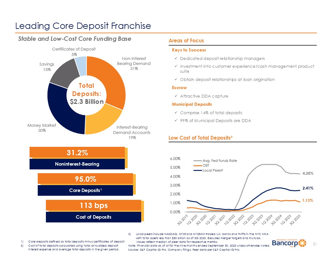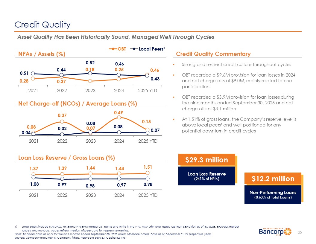 C&I Portfolio Geographic Composition C&I Portfolio by Industry Total C&I: $243 Million Total C&I: $ 243 Million Significant Diversification Across Markets of Operation and Industry Exposure +HDOWKFDUH 5HDO(VWDWH )LQDQFH ,QVXUDQFH &RQVWUXFWLRQ 2WKHU +RWHO 0RWHO 0DQX IDFWXULQJ (QWHUSULVH0JPW &RQWUDFWRUV $GPLQ0JPW :KROHVDOH7UDGH 3URI 6FL 7HFK 6UYFV Credit Quality 20 1) Local peers include NASDAQ, NYSE and NYSEAM traded U.S. banks and thrifts in the NYC MSA with total assets less than $50 bill ion as of 3Q 2025. Excludes merger targets and mutuals. Values reflect median of peer data for respective metrics. Note: Financial data as of or for the nine months ended September 30, 2025 unless otherwise noted. Data as of December 31 for re spective years. Source: Company documents, Company filings, Peer data per S&P Capital IQ Pro. Asset Quality Has Been Historically Sound, Managed Well Through Cycles • Strong and resilient credit culture throughout cycles • OBT recorded a $ 9.6 M provision for loan losses in 2024 and net charge - offs of $ 9.0M, mainly related to one participation • OBT recorded a $3.9M provision for loan losses during the nine months ended September 30, 2025 and net charge - offs of $3.1 million • At 1.51% of gross loans, the Company’s reserve level is above local peers¹ and well - positioned for any potential downturn in credit cycles Credit Quality Commentary <7' <7' NPAs / Assets (%) Net Charge - off (NCOs) / Average Loans (%) <7' Loan Loss Reserve / Gross Loans (%) 4 2%7 /RFDO3HHUV ñ $12.2 million Non - Performing Loans (0.63% of Total Loans) $29.3 million Loan Loss Reserve (241% of NPLs)