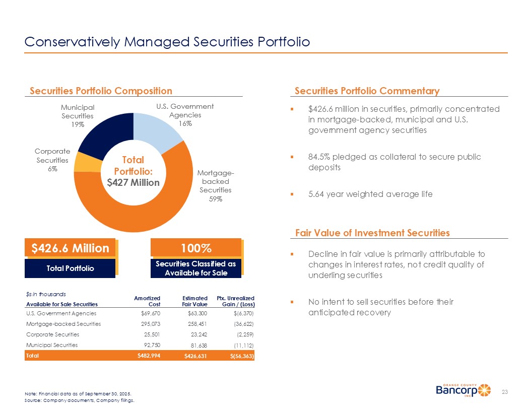 Liquidity Overview 22 Note: Financial data as of September 30, 2025 unless otherwise noted. Source: Company filings. Strong Recent Deposit Growth and Significant Borrowing Capacity • Borrowings consist of both short - term and long - term borrowings and provide the Company with one of its sources of funding • Maintaining available borrowing capacity provides the Company with a contingent source of liquidity • FHLBNY short - term borrowings decreased by $91.0 million, or 80.2%, to $22.5 million as of September 30, 2025, as compared to $113.5 million at December 31, 2024 • The decrease in borrowings continues to reflect a strategic decision to manage liquidity sources and take advantage of opportunities to reduce funding costs. • As of September 30, 2025, the Bank’s unused borrowing capacity with the FHLBNY was $557.0 million • Uninsured deposits, net of fully collateralized municipal relationships, remain stable and represent approximately 45% of total deposits at September 30, 2025 8 6 *RYHUQPHQW $JHQFLHV 0RUWJDJH EDFNHG 6HFXULWLHV &RUSRUDWH 6HFXULWLHV 0XQLFLSDO 6HFXULWLHV Conservatively Managed Securities Portfolio 23 Note: Financial data as of September 30, 2025.