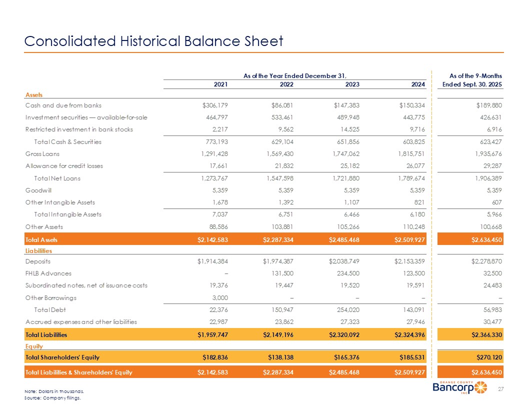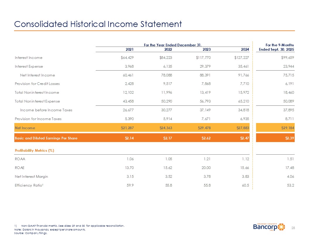 Consolidated Historical Balance Sheet 27 As of the Year Ended December 31, As of the 9-Months 2021 2022 2023 2024 Ended Sept. 30, 2025 Assets Cash and due from banks $306,179 $86,081 $147,383 $150,334 $189,880 Investment securities — available-for-sale 464,797 533,461 489,948 443,775 426,631 Restricted investment in bank stocks 2,217 9,562 14,525 9,716 6,916 Total Cash & Securities 773,193 629,104 651,856 603,825 623,427 Gross Loans 1,291,428 1,569,430 1,747,062 1,815,751 1,935,676 Allowance for credit losses 17,661 21,832 25,182 26,077 29,287 Total Net Loans 1,273,767 1,547,598 1,721,880 1,789,674 1,906,389 Goodwill 5,359 5,359 5,359 5,359 5,359 Other Intangible Assets 1,678 1,392 1,107 821 607 Total Intangible Assets 7,037 6,751 6,466 6,180 5,966 Other Assets 88,586 103,881 105,266 110,248 100,668 Total Assets $2,142,583 $2,287,334 $2,485,468 $2,509,927 $2,636,450 Liabilities Deposits $1,914,384 $1,974,387 $2,038,749 $2,153,359 $2,278,870 FHLB Advances – 131,500 234,500 123,500 32,500 Subordinated notes, net of issuance costs 19,376 19,447 19,520 19,591 24,483 Other Borrowings 3,000 – – – – Total Debt 22,376 150,947 254,020 143,091 56,983 Accrued expenses and other liabilities 22,987 23,862 27,323 27,946 30,477 Total Liabilities $1,959,747 $2,149,196 $2,320,092 $2,324,396 $2,366,330 Equity Total Shareholders' Equity $182,836 $138,138 $165,376 $185,531 $270,120 Total Liabilities & Shareholders' Equity $2,142,583 $2,287,334 $2,485,468 $2,509,927 $2,636,450 Note: Dollars in thousands. Source: Company filings.