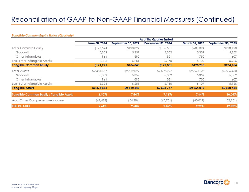 Tangible Common Equity Ratios (Quarterly) As of the Quarter Ended June 30, 2024 September 30, 2024 December 31, 2024 March 31, 2025 September 30, 2025 Total Common Equity $177,544 $193,094 $185,531 $201,324 $270,120 Goodwill 5,359 5,359 5,359 5,359 5,359 Other Intangibles 964 892 821 750 607 Less: Total Intangible Assets 6,323 6,251 6,180 6,109 5,966 Tangible Common Equity $171,221 $186,843 $179,351 $195,215 $264,154 Total Assets $2,481,157 $2,519,099 $2,509,927 $2,560,128 $2,636,450 Goodwill 5,359 5,359 5,359 5,359 5,359 Other Intangibles 964 892 821 750 607 Less: Total Intangible Assets 6,323 6,251 6,180 6,109 5,966 Tangible Assets $2,474,834 $2,512,848 $2,503,747 $2,554,019 $2,630,484 Tangible Common Equity / Tangible Assets 6.92% 7.44% 7.16% 7.64% 10.04% Acc. Other Comprehensive Income (67,433) (54,386) (67,751) (60,019) (52,151) TCE Ex. AOCI 9.64% 9.60% 9.87% 9.99% 12.02% Reconciliation of GAAP to Non - GAAP Financial Measures (Continued) 30 Note: Dollars in thousands. Source: Company filings.