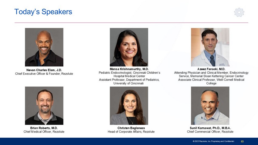 Attending Physician and Clinical Member, Endocrinology Service, Memorial Sloan Kettering Cancer Center Associate Clinical Professor, Weill Cornell Medical College Today's Agenda 04 © 2025 Rezolute, Inc. Proprietary and Confidential. 01 Welcome & Opening Remarks Nevan Charles Elam, J.D. 02 Congenital Hyperinsulinism (HI): Background, Patient Journey, & Current Treatment Landscape Mansa Krishnamurthy, M.D. 03 Tumor HI: Background, Patient Journey, & Current Treatment Landscape Azeez Farooki , M.D. 04 Overview of Rezolute’s Phase 3 Clinical Programs in Congenital HI and Tumor HI Brian Roberts, M.D. 06 Real - World Impact of Ersodetug & Closing Remarks Christen Baglaneas 07 Q&A Session 05 Defining Ersodetug’s Commercial Potential Sunil Karnawat, Ph.D., M.B.A.