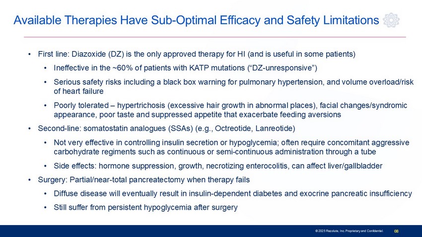* Based on the Forian and Compass claims data Significant Unmet Clinical Need • Often presents within first month of life; most common cause of hypoglycemia in infants and children • Risk of seizure, coma, and death • Neurologic damage is a concern in all patients and occurs in ~50% of patients • Brain is highly dependent on glucose as its primary energy source • Disease can lead to decreased brain volume, cognitive impairment, developmental delays, etc. • Families undertake substantial effort to avoid critical hypoglycemia • Quality of life is severely and adversely impacted • Constant monitoring, excessive/abnormal feeding patterns, socialization, development, sleep, work, etc. • Early detection and better treatments for hypoglycemia are needed Severe persistent hypoglycemia is the key clinical presentation 07 © 2025 Rezolute, Inc. Proprietary and Confidential. Sources: 1. Avatapalle HB et al. Abnormal Neurodevelopmental Outcomes in CHI. Front Endocrinol. 2013; and related systematic reviews; 2. Kubsad PS et al. Clinical Profile and Efficacy of Long - Acting Octreotide in CHI. 2024; 3. Roeper et al. Transitional Neonatal Hypoglycemia and Adverse Neurodevelopment in Midchildhood.2024; 4. Edwards et al. Neurocognitive Outcomes at Age 2 Years After Neonatal Hypoglycemia in a Cohort of Participants from the hPOD Randomized Trial. 2022; 5. Li Wang et al. Research Advances in Neonatal Hypoglycemic Brain Injury. 2024; 6. Cacciatore et al. I mpact of Glucose Metabolism on the Developing Brain.