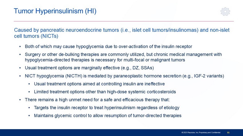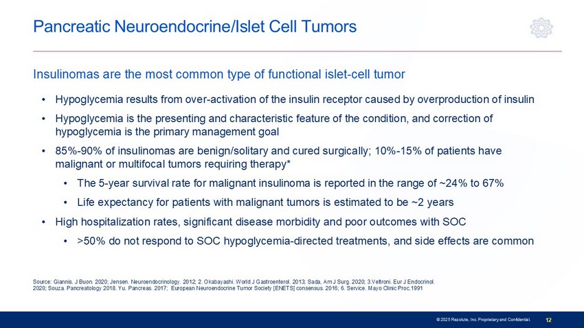 Attending Physician and Clinical Member, Endocrinology Service, Memorial Sloan Kettering Cancer Center Associate Clinical Professor, Weill Cornell Medical College Tumor Hyperinsulinism (HI) • Both of which may cause hypoglycemia due to over - activation of the insulin receptor • Surgery or other de - bulking therapies are commonly utilized, but chroni c medical management with hypoglycemia - directed therapies is necessary for multi - focal or malignant tumors • Usual treatment options are marginally effective (e.g., DZ , SSAs) • NICT hypoglycemia (NICTH) is mediated by paraneoplastic hormone secretion (e.g., IGF - 2 variants) • Usual treatment options aimed at controlling insulin are ineffective • Limited t reatment options other than high - dose systemic corticosteroids • There remains a high unmet need for a safe and efficacious therapy that: • T argets the insulin receptor to treat hyperinsulinism regardless of etiology • Maintains glycemic control to allow resumption of tumor - directed therapies Caused by pancreatic neuroendocrine tumors ( i.e., islet cell tumors/insulinomas) and non - islet cell tumors (NICTs) 11 © 2025 Rezolute, Inc. Proprietary and Confidential.