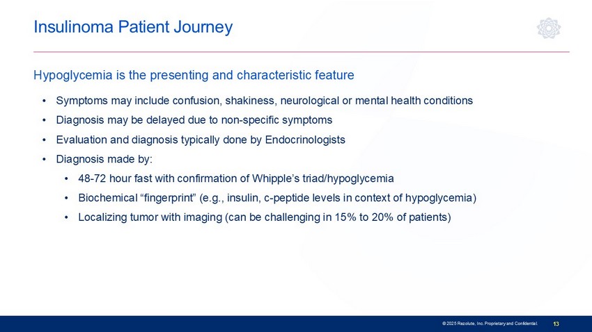 Pancreatic Neuroendocrine/Islet Cell Tumors • Hypoglycemia results from over - activation of the insulin receptor caused by overproduction of insulin • Hypoglycemia is the presenting and characteristic feature of the condition, and correction of hypoglycemia is the primary management goal • 85% - 90 % of insulinomas are benign /solitary and cured surgically; 10 % - 15% of patients have malignant or multifocal tumors requiring therapy* • The 5 - year survival rate for malignant insulinoma is reported in the range of ~24% to 67% • Life expectancy for patients with malignant tumors is estimated to be ~2 years • High hospitalization rates, significant disease morbidity and poor outcomes with SOC • >50% do not respond to SOC hypoglycemia - directed treatments, and side effects are common Insulinomas are the most common type of functional islet - cell tumor 12 © 2025 Rezolute, Inc. Proprietary and Confidential. Source: Giannis. J Buon. 2020; Jensen. Neuroendocrinology. 2012; 2. Okabayashi. World J Gastroenterol. 2013; Sada, Am J Surg. 20 20; 3.Veltroni. Eur J Endocrinol. 2020; Souza. Pancreatology 2018. Yu. Pancreas. 2017; European Neuroendocrine Tumor Society [ENETS] consensus. 2016; 6. Servi ce.