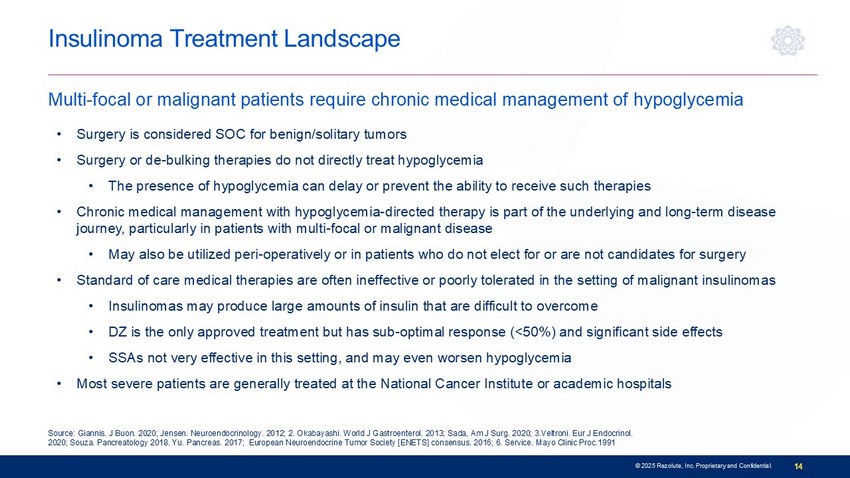 Mayo Clinic Proc.1991 Insulinoma Patient Journey • Symptoms may include confusion, shakiness, neurological or mental health conditions • Diagnosis may be delayed due to non - specific symptoms • Evaluation and diagnosis typically done by Endocrinologists • Diagnosis made by: • 48 - 72 hour fast with confirmation of Whipple’s tria d/hypoglycemia • Biochemical “fingerprint” ( e.g ., insulin, c - peptide levels in context of hypoglycemia) • Localizing tumor with imaging (can be challenging in 15% to 20% of patients ) Hypoglycemia is the presenting and characteristic feature 13 © 2025 Rezolute, Inc. Proprietary and Confidential.