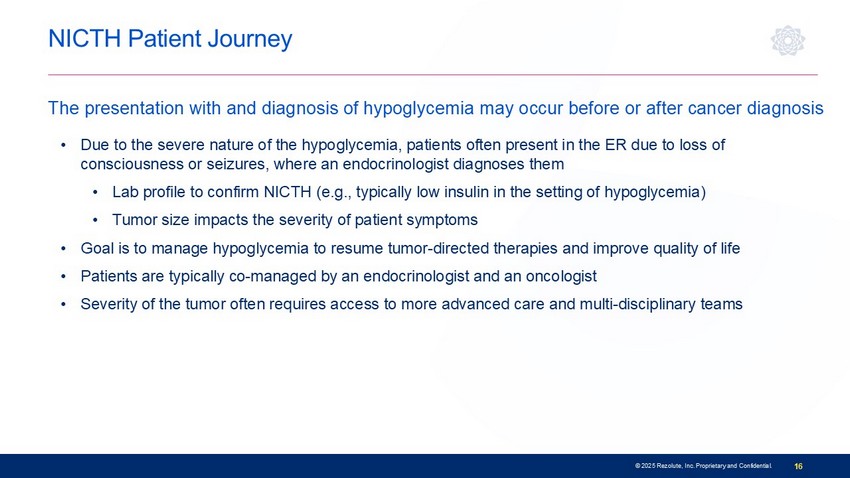 Mayo Clinic Proc.1991 NICTH • These growth factors bind to and over - activate the insulin receptor • NICTs are large and generally diagnosed before the onset of hypoglycemia • Incidence of NICTH may be higher than insulinomas due to its occurrence in 15+ large tumor types, underdiagnosis, and lack of physician and patient awareness • 60% of tumors are malignant; 4 0% are benign • Severe cases of hypoglycemia can be associated with: • High hospitalization rates and poor outcomes with standard of care • Seizures, loss of consciousness, and even death due to neuroglycopenia Tumors may secrete insulin - like substances (e.g., IGF - 2 variants) causing hypoglycemia 15 © 2025 Rezolute, Inc. Proprietary and Confidential.