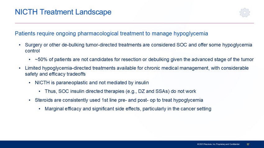 NICTH Patient Journey • Due to the severe nature of the hypoglycemia, patients often present in the ER due to loss of consciousness or seizures, where an endocrinologist diagnoses them • Lab profile to confirm NICTH (e.g., typically low insulin in the setting of hypoglycemia) • Tumor s ize impacts the severity of patient symptoms • Goal is to manage hypoglycemia to resume tumor - directed therapies and improve quality of life • Patients are typically co - managed by an endocrinologist and an oncologist • Severity of the tumor often requires access to more advanced care and multi - disciplinary teams The presentation with and diagnosis of hypoglycemia may occur before or after cancer diagnosis 16 © 2025 Rezolute, Inc. Proprietary and Confidential.