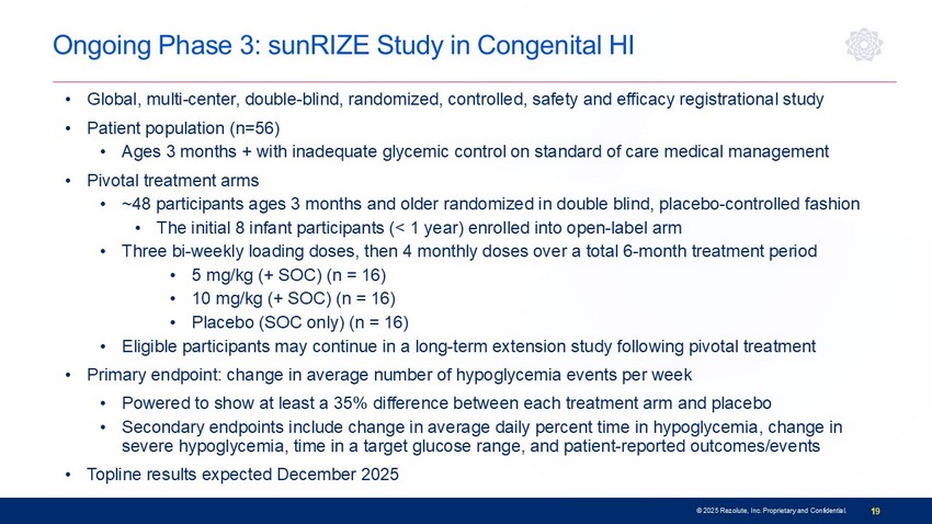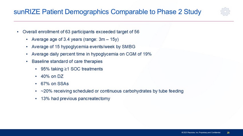 Chief Medical Officer, Rezolute Ongoing Phase 3: sunRIZE Study in Congenital HI • Global, multi - center, double - blind, randomized, controlled, safety and efficacy registrational study • Patient population (n=56) • Ages 3 months + with inadequate glycemic control on standard of care medical management • Pivotal treatment arms • ~48 participants ages 3 months and older randomized in double blind, placebo - controlled fashion • The initial 8 infant participants (< 1 year) enrolled into open - label arm • Three bi - weekly loading doses, then 4 monthly doses over a total 6 - month treatment period • 5 mg/kg (+ SOC) (n = 16) • 10 mg/kg (+ SOC) (n = 16) • Placebo (SOC only) (n = 16) • Eligible participants may continue in a long - term extension study following pivotal treatment • Primary endpoint: change in average number of hypoglycemia events per week • Powered to show at least a 35% difference between each treatment arm and placebo • Secondary endpoints include change in average daily percent time in hypoglycemia, change in severe hypoglycemia, time in a target glucose range, and patient - reported outcomes/events • Topline results expected December 2025 19 © 2025 Rezolute, Inc. Proprietary and Confidential.