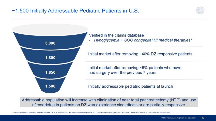 Chief Commercial Officer, Rezolute © 2025 Rezolute, Inc. Proprietary and Confidential. 24 18% 23% 33% 16% 10% 0% 10% 20% 30% 40% 0 to 2 3 to 5 6 to 10 11 to 17 18+ Patients Age Distribution* Congenital HI: Market Insights • Updated Incidence • 1:22,000* versus literature - based 1:28,000 + births • Revised incidence of 165 vs.130 births per year • Treatment Insights • >80% of the patients are treated at ~90 Major Children’s Hospitals • ~400+ pediatric endocrinologists treat the majority of patients • ~25% of patients are managed at Children's Hospital of Philadelphia and Cook Children’s • Diagnosis occurs in the first month of life in ~65% of patients • By end of first year ~90% of patients have been diagnosed • Patient Mix • 90% are children, three - quarters of which are under age 10 * Based on the Forian and Veeva Compass claims data; + https://karger.com/hrp/article/98/5/566/909386/The - Birth - Prevalence - of - Congenital - Hyperinsulinism © 2025 Rezolute, Inc. Proprietary and Confidential. 25 Verified in the claims database 1 • Hypoglycemia + SOC congenital HI medical therapies* 1 Claims database: Forian and Veeva Compass. *SOC = Standard of Care which includes Diazoxide (DZ), Somatostatin Analogs (SSAs), and NTP. There is no s pe cific ICD - 10 code for congenital HI. 1,500 1,650 1,800 3,000 Addressable population will increase with elimination of near total pancreatectomy (NTP) and use of ersodetug in patients on DZ who experience side effects or are partially responsive Initial market after removing ~5% patients who have had surgery over the previous 7 years Initial market after removing ~40% DZ responsive patients ~1,500 Initially Addressable Pediatric Patients in U.S. Initially addressable pediatric patients at launch