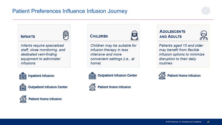 Vast Majority of Patients Managed at Major Children’s Hospitals (MCHs) ~25% ~30% ~25% ~20% 2 centers of excellence ~35 large academic hospitals ~50 small academic hospitals ~250 community clinics Tier 1 MCH Tier 2 MCH Tier 3 MCH Tier 4 ~80% of congenital HI patients are treated at ~90 MCHs* © 2025 Rezolute, Inc. Proprietary and Confidential. 27 Patient Preferences Influence Infusion Journey I NFANTS C HILDREN A DOLESCENTS AND A DULTS Children may be suitable for infusion therapy in less intensive and more convenient settings ( i .e., at home ) Patients aged 10 and older may benefit from flexible infusion options to minimize disruption to their daily routines Patient Home Infusion Outpatient Infusion Center Patient Home Infusion Outpatient Infusion Center Patient Home Infusion Inpatient Infusion Infants require specialized staff, close monitoring, and dedicated vein - finding equipment to administer infusions © 2025 Rezolute, Inc. Proprietary and Confidential. 28 Payers Acknowledge Ersodetug’s Compelling Efficacy • Payers Believe: • High unmet need in congenital HI • Ersodetug has demonstrated meaningful efficacy • Payers Anticipate: • Ultra - rare pediatric disease pricing • DZ trial before use of ersodetug • Payer Mix: • Commercial insurance and Medicaid cover 90% of patients • Limited Medicare exposure 61% 12% 17% 2% 8% Payer mix estimate Commercial Managed Medicaid FFS Medicaid Medicare Others/Tricare/VA/DoD