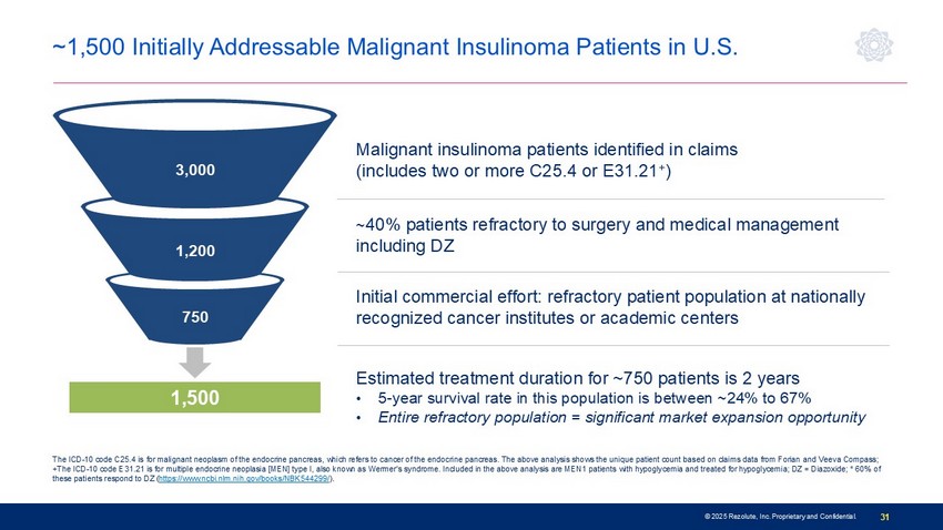 30 Malignant Insulinoma: Market Insights • Insulinoma is a clearly defined market with high unmet need and an established prescriber base • Generally managed at ~300 academic centers/national cancer institutes • Adult endocrinologists primarily treat hypoglycemia in this population • Established codes for malignant insulinoma patients enable patient identification • High hospitalization rates, significant disease morbidity, and poor outcomes with SOC • Upside potential • Peri - operative management of solitary/benign tumors • Solitary/benign tumors where surgery may not be ideal (e.g., contraindications or inability to localize) Persistent uncontrolled hypoglycemia is the characteristic feature © 2025 Rezolute, Inc. Proprietary and Confidential. 31 Malignant insulinoma patients identified in claims (includes two or more C25.4 or E31.21 + ) ~ 40% patients refractory to surgery and medical management including DZ Initial commercial effort: refractory patient population at nationally recognized cancer institutes or academic centers 1,500 3,000 1,200 750 The ICD - 10 code C25.4 is for malignant neoplasm of the endocrine pancreas, which refers to cancer of the endocrine pancreas. The above analysis shows the unique patient count based on claims data from Forian and Veeva Compass; +The ICD - 10 code E31.21 is for multiple endocrine neoplasia [MEN] type I, also known as Wermer's syndrome. Included in the above analysis are MEN1 patients with hypoglycemia and treated for hypoglycemia; DZ = Diazoxide; * 60% of these patients respond to DZ ( https://www.ncbi.nlm.nih.gov/books/NBK544299/ ). Estimated treatment duration for ~750 patients is 2 years • 5 - year survival rate in this population is between ~24% to 67% • Entire refractory population = significant market expansion opportunity ~1,500 Initially Addressable Malignant Insulinoma Patients in U.S.