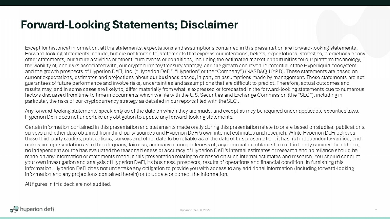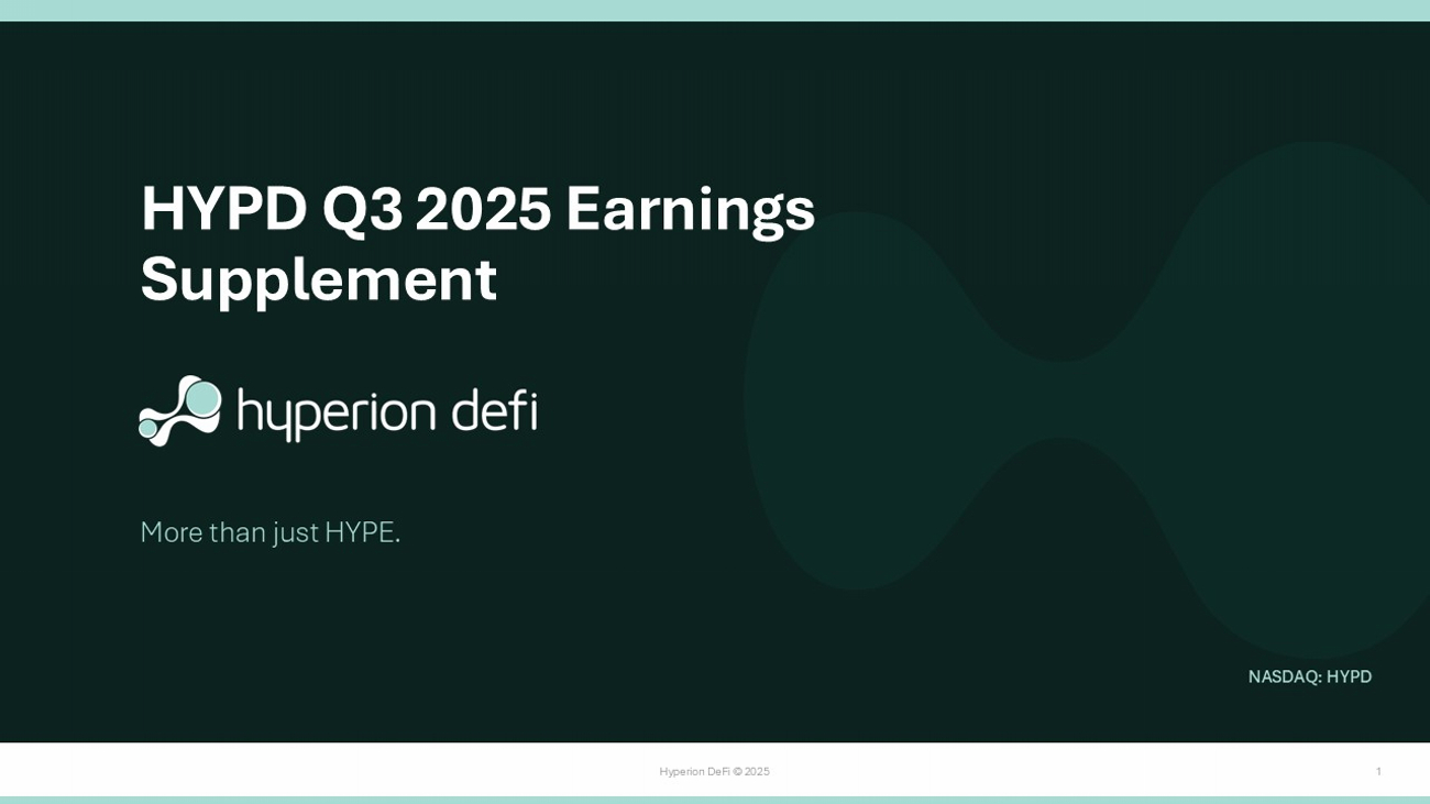 Hyperion DeFi, Inc.は、2025年第3四半期の業績に関する電話会議を米国東部時間11月13日午後5時に開催します。補足財務情報および特定の非GAAP指標と最も直接的に比較可能なGAAP指標との調整を含むスライド・プレゼンテーションは、電話会議の情報とともに、当社の投資家向けウェブサイト(https://ir.hyperiondefi.com/events-and-presentations)からアクセスできます。参加者は電話会議の前に電子メール(IR@hyperiondefi.com)で質問を提出することができます。電話会議のウェブキャストはアーカイブされ、当社ウェブサイトにて2025年11月27日(木)11:59までご覧いただけます。