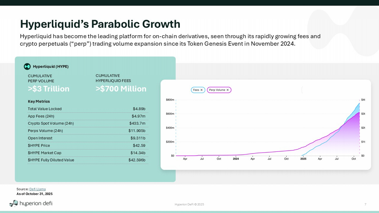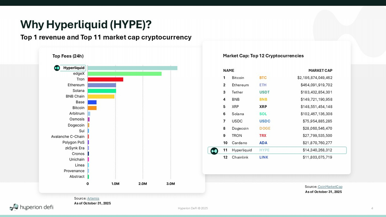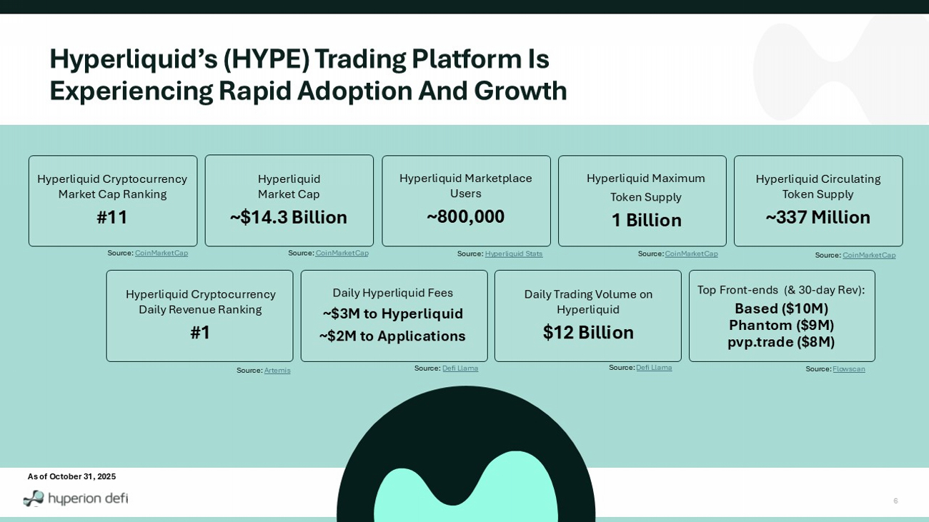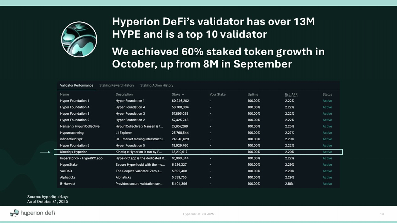 | · | Kinetiq x Hyperion ValidatorでステークされたHYPEトークンの数は、2025年9月30日時点で820万、10月31日時点で1320万と、前月比で60%増加した。(4) |