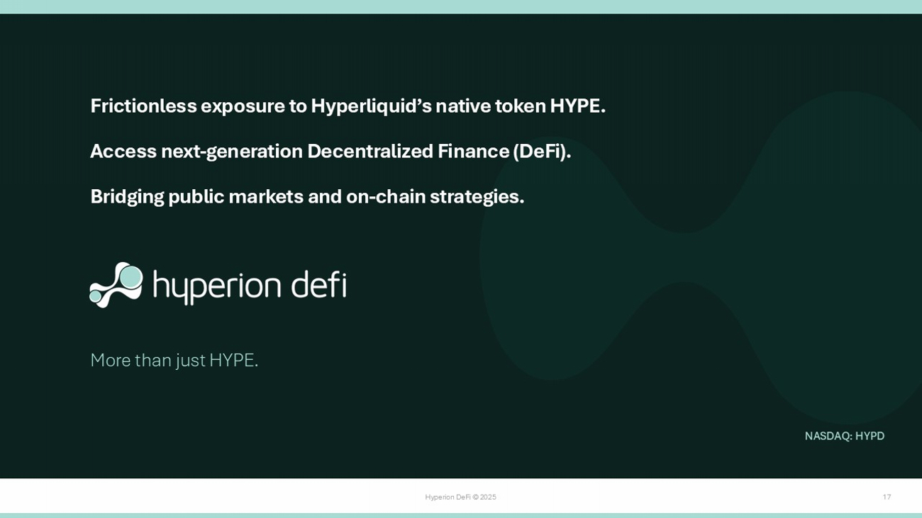 Hyperion DeFiは、HyperliquidのネイティブトークンであるHYPEの長期的な戦略的トレジャリーを構築する米国初の上場企業です。当社は、世界で最も急速に成長し、最も高い収益を生み出すブロックチェーンの1つであるHyperliquidエコシステムへの簡素化されたアクセスを株主に提供することに重点を置いています。株主は、HYPEのネイティブステーキング利回りとユニークなオンチェーンユーティリティから生み出される追加収益の両方から、徐々に複利的にHYPEへのエクスポージャーを得ることができます。