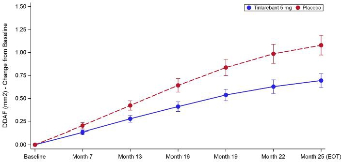 | · | In addition, Tinlarebant slowed decreased autofluorescence (DAF) lesion growth, the key secondary endpoint calculated as the sum of DDAF and questionably decreased autofluorescence (QDAF), in the study eye by 33.7% (p = 0.027) and in the fellow eye by 32.7% (p = 0.017). |