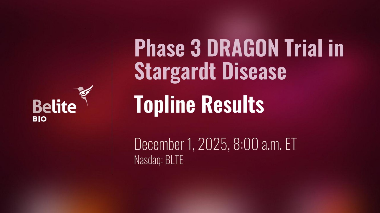 SAN DIEGO, December 1, 2025 (GLOBE NEWSWIRE) -- Belite Bio, Inc (NASDAQ: BLTE) (“Belite Bio” or the “Company”) today announced topline results from the global Phase 3 “DRAGON” trial of Tinlarebant, marking the first successful pivotal trial in patients with Stargardt disease type 1 (STGD1). STGD1 is an eye disease that leads to progressive vision loss, usually beginning in childhood or young adulthood, and currently has no approved treatment worldwide.